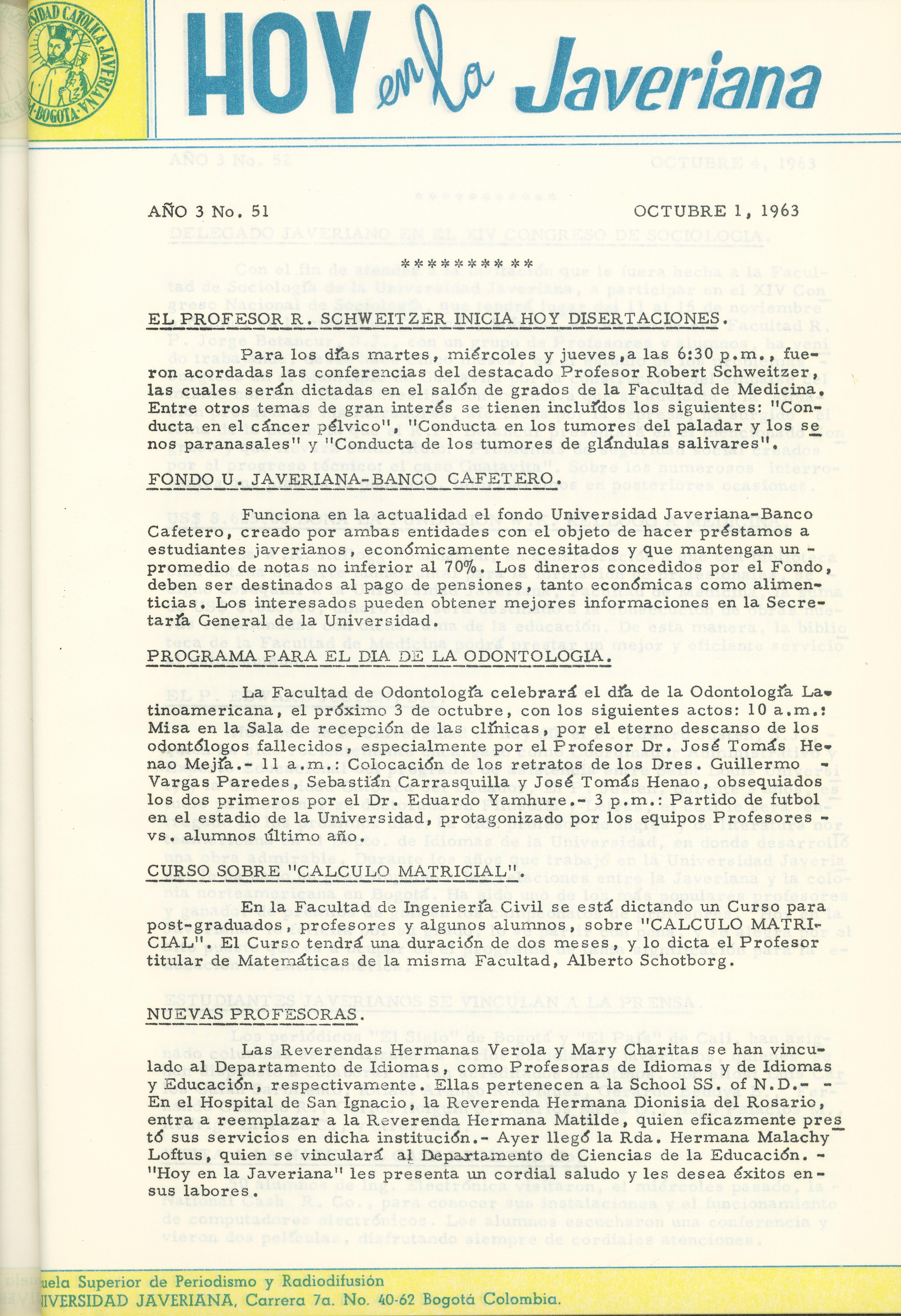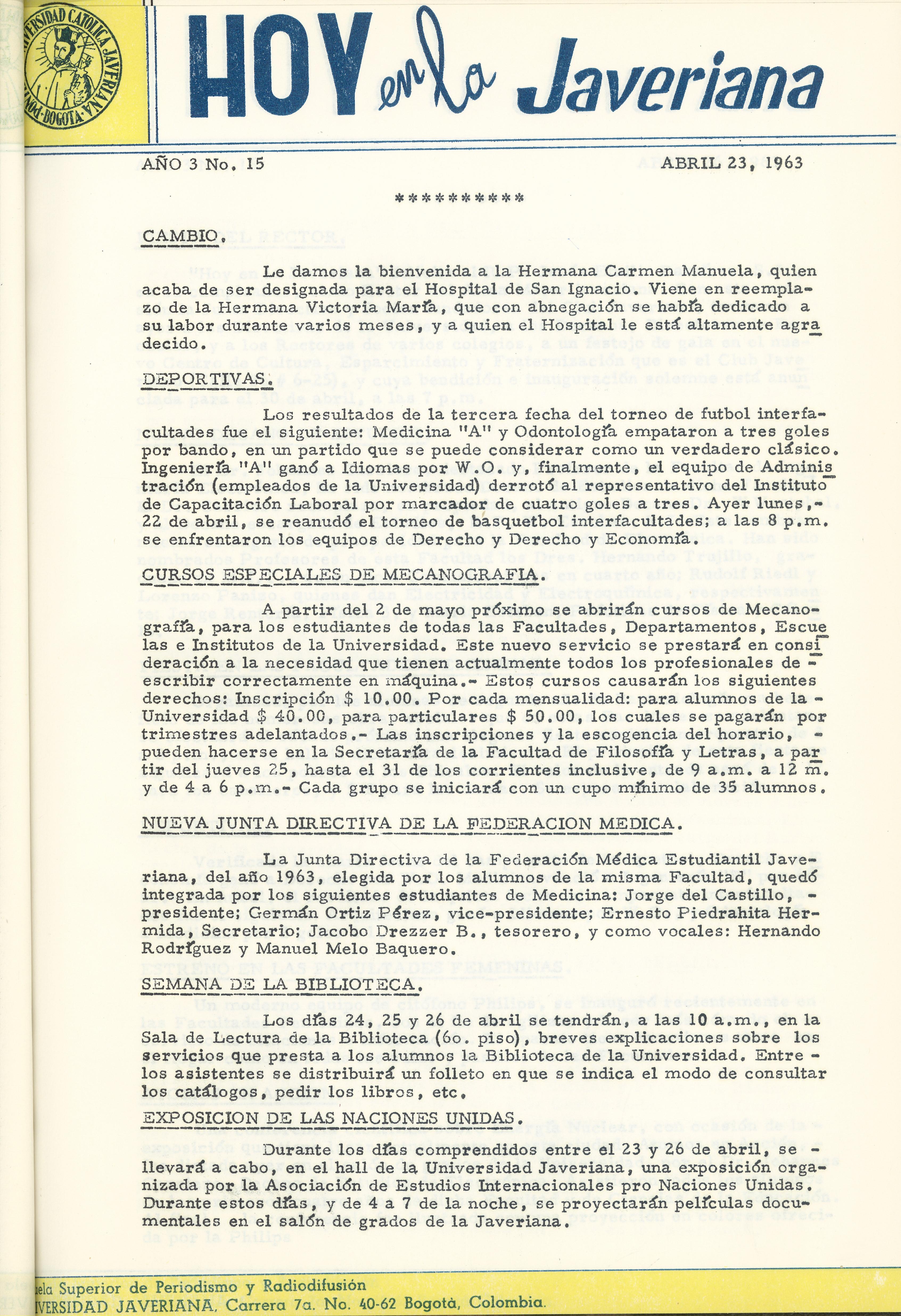 Las Reverendas Hermanas Vero1a y Mary Charitas se han vinculado al Departamento de Irriornas, corrlo Profesoras de ldiomas y de ldiomas y Educacidnr rcspectivarnente. E1las pertenecen a la School SS, of N. D.-En el Hospital de San lgnacio, la Reverenda Herrnana Dionisia del Rosario, entra a reeñlplazar a la Reverenda Herrnana Matilde, quien eficazrnente preg td sus servicios en dicha institucidn.- Ayer llegd Ia Rda. Hermana Malachy- Loftus, quien se vinculará al Depa^rta.iuento de Ciencias de Ia Educacidn. { ttHoy en la Javerianatt les presenta un cordial saludo y Ies desea éxitos €rrsus labores