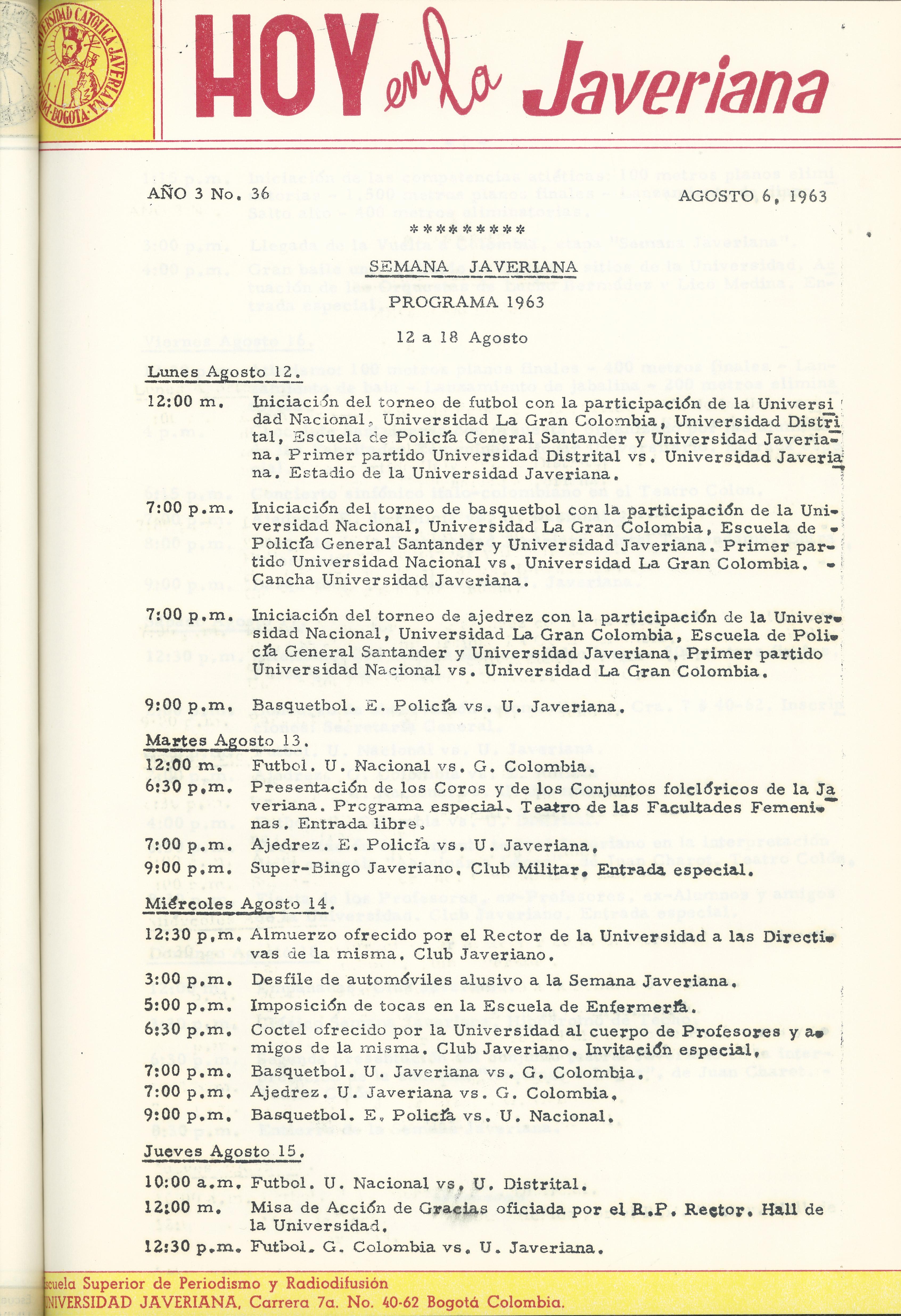 En clarfsirno cuadro inforrnativo, viene ppareciendo en los pe riddicos capitalinos las fechas Ce irrscripciones , exárnenes de adrnisión,exárnenes supletorios, rrr.atrfculas e iniciacidn de clases de las respectivas FacultaCes, Escuelas, Departarnentos y Cursos de tra Universidad Javeriana, para eI año de 1964. Asi rnisi':ro una nota q.ue dice: el recibo de derechos de pensidn, neces;l.rio para asentar la rnatrfcula r se puede obtener, con cualquier anti.cipacidn, en Ia Sindicatura de la Universidadr o en unc de los siguientes Bancos de la ciudad: Banco Comercial Antioqueño(Sucursal Farque Nacicnal) , Banque }lationale Four le Comrrrerce et I tIndustri.e (Catte I3 # '7-130), Bancc Grancol,¡rnbiano (Cra. ? # 13-41). (et Tiei::npo, Cctubre Z? Ce 1963 J