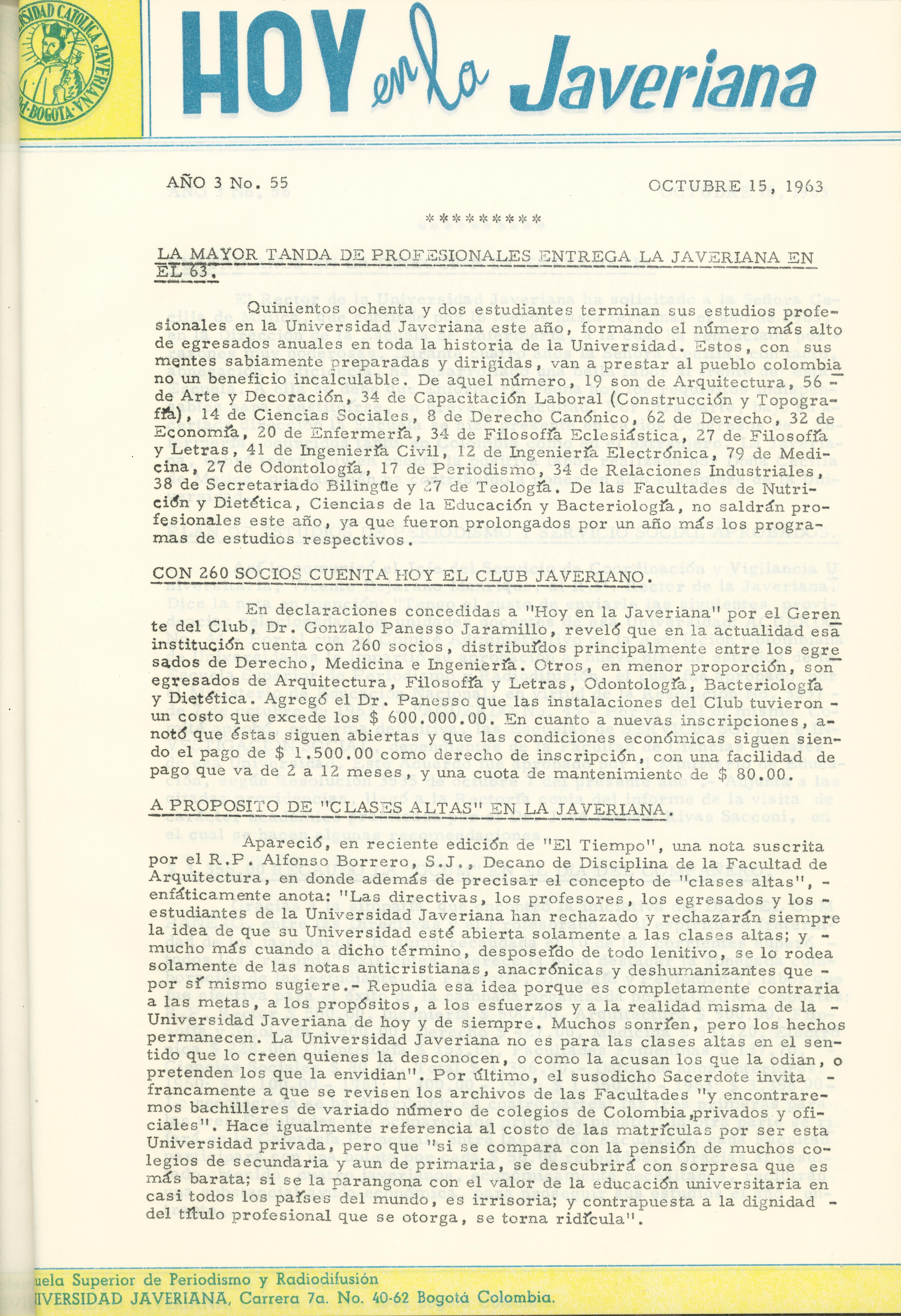 Apareció, en reciente edición Ce trEl Tiempotr, una nota suscrita Por eI R.F Alfonso Borrero ¡ S.J. ¡ Decano de Disciptina de la Facultad d.e Arquitecturar €rr donde además de precisar el concefto,Je'rclases altastt,enfáticamente anota: ttLas directivás, los profesores, los egresados y losestudiantes de la Universidad Javeriana han rechazado y ""Jh"zarán ui"rr.pr" la idea de que su Universidad está abierta solamente a ias clases altas; ymucho rnás cuando a dicho tdrrnino, desposefdo de todo lenitivor se 1o rodea solarnente de las notas anticristianas, aira"rdnicas y deshurnanizantes guePor sf misrno sugiere.- -Repudia esa idea porque es completarnente contraria a las metas, a los propdsitos, a los esfuerzos y a Ia "**iidad, rnisma de laUniversidad Javeriana de hoy y de siernpre. Múchos sonrfen, p€ro los hechos Permanecen' La Universidad Javeriana no es para las clases áltas en eI s€o- tido que 1o creen quienes la desconocen, o corno la acusan los que la odian, o pretenden los que la envidiantr. Por últinro, el susodicho Saceráote invita francarnente a que se revisen los archivos de las tr'acultad.es try encontrare- mo§ bachilleres de variado nrfmero de cclegios de Colombiu.Brirrados y ofi- cialesrt. Hace igualmente referencia al co"lo de las rnatrfcufás por ser esta Universidad privarlar p€To que ttsi se compara con la pensi$n de rnuchos co- legios de secundaria y aun d,e primaria, sL descubrirá con sorpresa que es rnds barata; si se la parangona con eI valor de }a educacidn universitaria en casi todos los pafses del mundor €§ irrisoria; y contrapuesta a Ia dignidad del tftul.o profesional que se otorga, se torna ,í¿fcotatr l