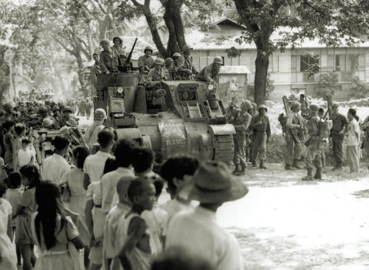U.S. soldiers receive a warm reception as they enter Cebu City in the Philippines. Most Filipinos welcomed American troops as liberators.