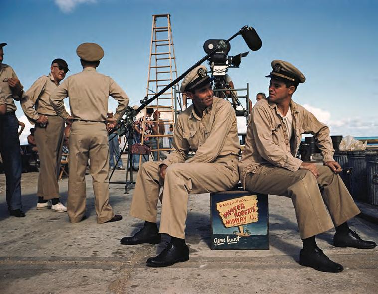 Ford is best known today for his Westerns, but I find it a little surprising that he didn’t direct more features set in World War II, since he loved the U.S. Navy and was very proud of his war experiences. We look at They Were Expendable, his 1945 adaptation of the Walter Lindsay White book, in this issue’s “Battle Films,” but the only other World War II feature Ford directed was 1955’s Mister Roberts. An adaptation of a successful play, it starred Henry Fonda (see “Familiar Face” on page 80 for more about Fonda’s military career), who was recreating his successful stage role, as well as James Cagney, William Powell, and Jack Lemmon. Mister Roberts is a much-loved movie, but it had a tumultuous production. Shooting started in September 1954 on location at Midway, 12 years after Ford’s experiences there during the war. But the director was drinking heavily, and Fonda was becoming increasingly disenchanted with the way the film was diverging from the play, especially with all the comic relief Ford was creating for Lemmon. When Fonda went to Ford’s room one evening to talk to the director about his concerns, Ford, who had been drinking, got infuriated and slugged him. The incident ended the friendship between the two men. Before long Ford fell ill and needed gallbladder surgery, so director Mervyn LeRoy stepped in to finish the film.