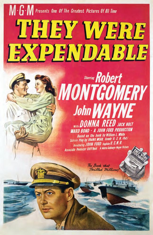 DIRECTOR JOHN FORD went on inactive status from the navy in 1944 to film an adaptation of They Were Expendable, William Lindsay White’s book about PT boats during the opening months of the war in the Philippines. The movie starred Robert Montgomery, who had joined the navy after Pearl Harbor and, like the character he plays, commanded a PT boat. John Wayne, who had not served in the war, was billed second. Back on a film set, Ford remained the same cantankerous needler he had been before the war and he zeroed in on “Duke” Wayne, one of his favorite targets. In Print the Legend, his Ford biography, author Scott Eyman relates how Montgomery