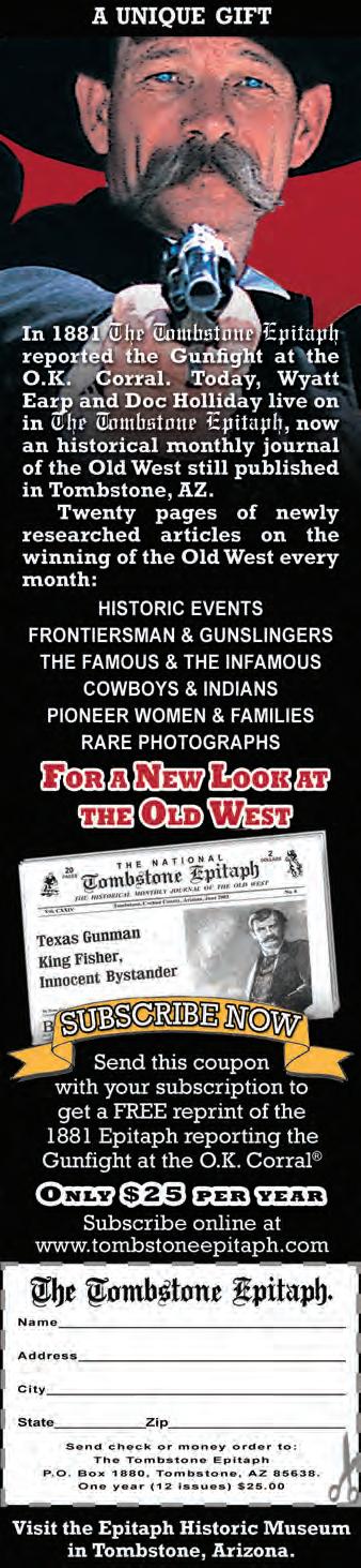 Our small, hardworking outfit includes senior editor Jon Guttman, art director Austin Stahl, photo editor Alex Griffith and a few dedicated special contributors. Lalire joins that list of contributors as editor emeritus. Our remuda of talented writers includes members of Western Writers of America (WWA), the Wild West History Association (WWHA), historians, scholars and a host of mavericks who just plain love the history of the American West. We strive to continue a tradition of excellence that has garnered our writers numerous awards, including several Six-Shooter Awards from WWHA, five Spur Awards from WWA and a half dozen bronze Wranglers from the National Cowboy & Western Heritage Museum in Oklahoma City. We’re proud of their accomplishments. They, and ever curious readers like you, are the reason for our longevity.