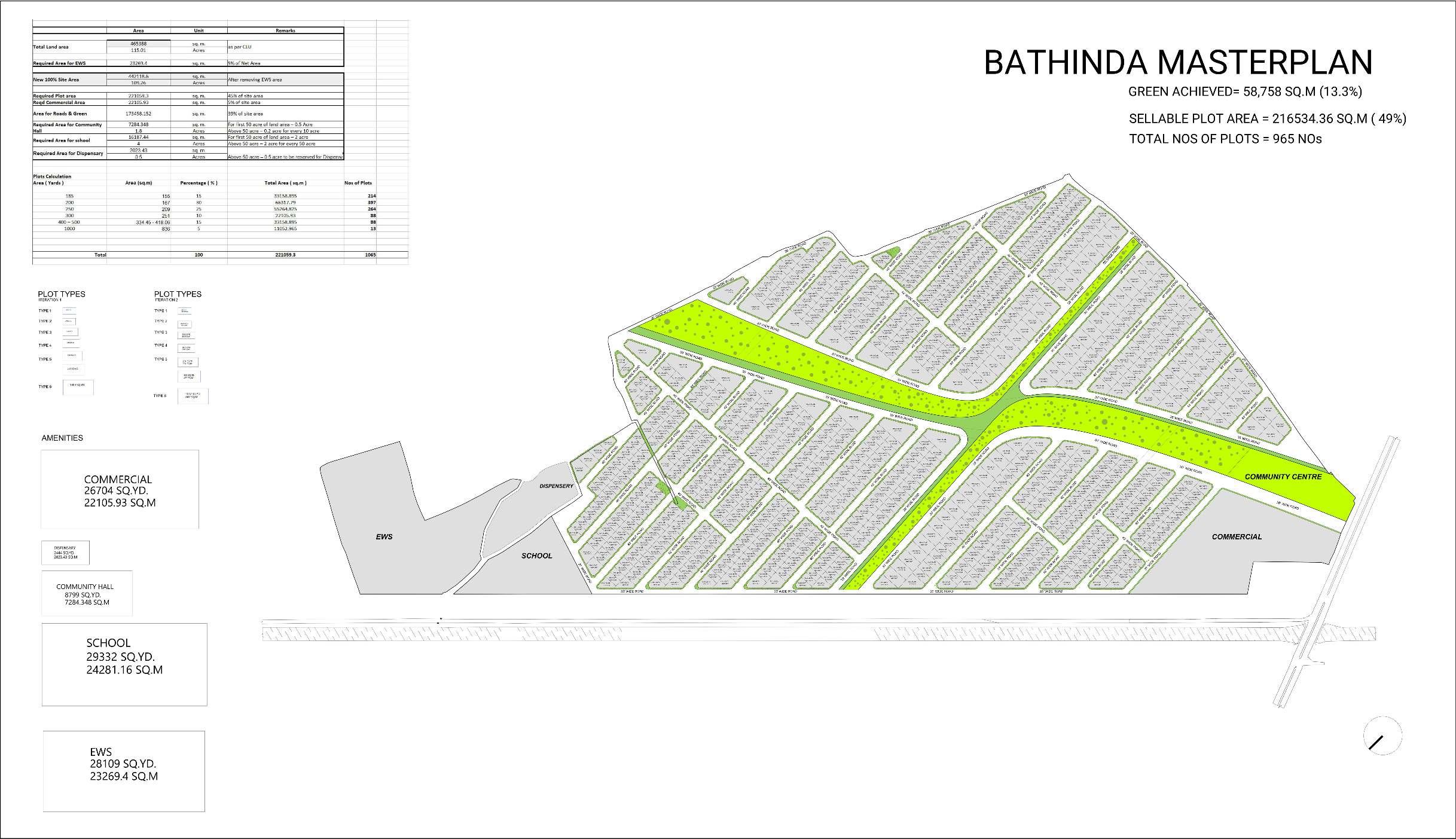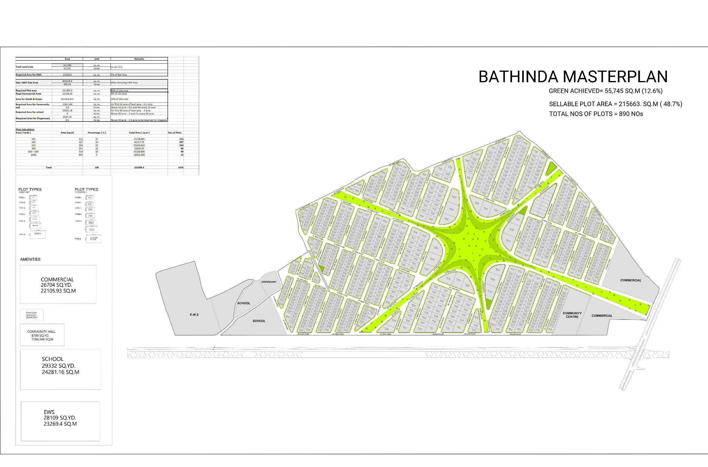 THE BHATINDA MASTER PLAN FOR DR. SURAJ WAS DEVELOPED AS A PART OF A HOUSING PROJECT. THE MASTER PLAN CONTAINS RESIDENTIAL PLOTTING OF VARYING SIZES AND A COMMUNITY CENTRE, E.W.S HOUSING, A SCHOOL, A DISPENSARY AND COMMERCIALSPACES.