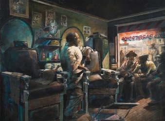 Different projects have been initiated with different goals. For instance, the Children Series was grown from a warm, nostalgic energy for the past. Proud Queen (cover image) speaks to identity and family. Our country’s sociological profile has sparked styles, traditions, or habits unique to various ethnic groups. Country club conversation and dancing was not available to most people of color historically, but thanks to the wait-for-yourturn system in the barbershop, dialogue occurred. Joe Lewis, Jackie Robinson, or the girl next door might have been the topic of the day, and through those conversations a friendly climate was born. The painting Barbershop (fig. 4) is about that amiable atmosphere.