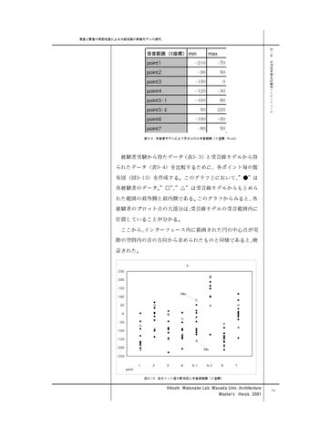 被験者実験から得たデータ(表3- 3)と受音線モデルから得 られたデータ(表3- 4)を比較するために、各ポイント毎の散 布図(図3- 13)を作成する。このグラフ上において、 ”●”は 各被験者のデータ。”□” 、”△”は受音線モデルからもとめら れた範囲の最外側と最内側である。このグラフからみると、各 被験者のプロット点の大部分は、 受音線モデルの受音範囲内に 位置していることが分かる。 ここから、 インターフェース内に描画された円の中心点が実 際の空間内の音の方向から求められたものと同様であると、 検 証された。 X 250 200 150