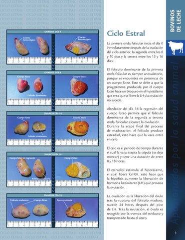 Ciclo Estral La primera onda folicular inicia el día 0 inmediatamente después de la ovulación del ciclo anterior, la segunda entre los 8 y 10 días y la tercera entre los 15 y 16 días. El folículo dominante de la primera onda folicular es siempre anovulatorio, porque se encuentra en presencia de un cuerpo lúteo. Esto se debe a que la progesterona producida por el cuerpo lúteo hace un bloqueo en el hipotálamo que evita que se libere la LH y la ovulación no sucede. Alrededor del día 16 la regresión del cuerpo lúteo permite que el folículo dominante de la segunda o tercera onda folicular alcance la ovulación. Durante la etapa final del proceso de maduración, el folículo produce estradiol, esto hace que la vaca entre en celo. El celo es el periodo de tiempo durante el cual la vaca acepta la cópula (se deja montar) y tiene una duración de entre 8 y 18 horas. El estradiol estimula al hipotálamo, el cual libera GnRH, esto hace que la hipófisis aumente la liberación de hormona luteinizante (LH) que provoca la ovulación. La ovulación es la liberación del óvulo tras la ruptura del folículo maduro, sucede 24 horas después del pico de LH. Tras la ovulación, el óvulo es recogido por la trompa del oviducto y transportado hasta el útero.