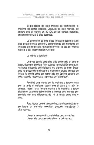 El propósito de este manejo es someterlas al máximo de estrés posible. Después de este manejo, se espera que al menos un 30-40% de las cerdas tratadas, entren en celo 2 ó 3 días después. La detección de celo debe iniciarse desde los 2.5 días posteriores al destete y dependiendo del momento de iniciado el celo será la rutina de servicio, ya sea por monta natural o por Inseminación Artificial. La monta o servicio. Una vez que la cerda ha sido detectada en celo o calor, debe ser servida. Aún cuando la ovulación se da 2448 horas después de iniciados los signos de celo. Dado que no puede determinarse el momento exacto en que se inicia, la cerda debe ser reportada en óptimo estado de celo, cuando responda a la prueba de “cabalgue”. Recibirá una monta por la mañana o tarde y otra por la tarde o mañana, según sea el caso y si aún lo acepta, repetir una tercera monta a la mañana o tarde siguiente. La cerda debe recibir al menos dos montas por servicio con una diferencia de 10-12 horas entre una y otra. Para lograr que el verraco haga un buen trabajo y se logre un servicio efectivo, pueden manejarse 3 alternativas: − −