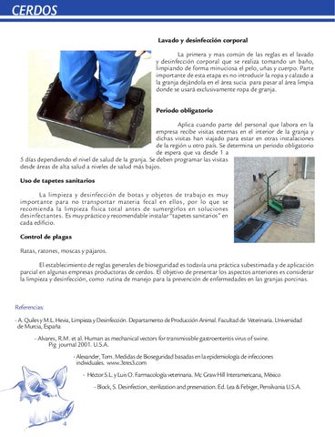 Aplica cuando parte del personal que labora en la empresa recibe visitas externas en el interior de la granja y dichas visitas han viajado para estar en otras instalaciones de la región u otro país. Se determina un periodo obligatorio de espera que va desde 1 a 5 días dependiendo el nivel de salud de la granja. Se deben programar las visitas desde áreas de alta salud a niveles de salud más bajos. Uso de tapetes sanitarios La limpieza y desinfección de botas y objetos de trabajo es muy importante para no transportar materia fecal en ellos, por lo que se recomienda la limpieza física total antes de sumergirlos en soluciones desinfectantes. Es muy práctico y recomendable instalar “tapetes sanitarios” en cada edificio. Control de plagas Ratas, ratones, moscas y pájaros. El establecimiento de reglas generales de bioseguridad es todavía una práctica subestimada y de aplicación parcial en algunas empresas productoras de cerdos. El objetivo de presentar los aspectos anteriores es considerar la limpieza y desinfección, como rutina de manejo para la prevención de enfermedades en las granjas porcinas.