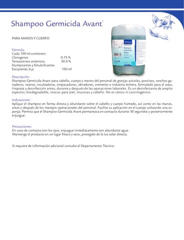 Descripción: Shampoo Germicida Avant para cabello, cuerpo y manos del personal de granjas avícolas, porcinas, ranchos ganaderos, rastros, incubadoras, empacadoras, obradores, cremerías e industria lechera, formulado para el aseo, limpieza y desinfección antes, durante y después de las operaciones laborales. Es un desinfectante de amplio espectro, biodegradable, inocuo para piel, mucosas y cabello. No es tóxico ni carcinogénico. Indicaciones: Aplique el shampoo en forma directa y abundante sobre el cabello y cuerpo húmedo, así como en las manos, antes y después de los manejos operacionales del personal. Facilite su aplicación en el cuerpo utilizando una esponja. Permita que el Shampoo Germicida Avant permanezca en contacto durante 30 segundos y posteriormente enjuague. Precauciones: En caso de contacto con los ojos, enjuague inmediatamente con abundante agua. Mantenga el producto en un lugar fresco y seco, protegido de la luz solar directa. Si requiere de información adicional consulte al Departamento Técnico.