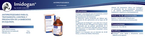 Imidogan® está indicado para el tratamiento, control y prevención de la Babesiosis en equinos. Recomendaciones de tratamiento: En Babesiosis equina producida por Babesia equi, se requiere de dos aplicaciones con un lapso de 48 horas. La aplicación de Imidogan® a una dosis de 2 ml por cada 100 kg de peso protegerá a los equinos contra la Babesiosis por un período aproximado de 4 semanas. Si el animal fue infectado antes o después del tratamiento, se desarrollará inmunidad contra esta enfermedad. Repetir si es necesario con un intervalo de 24-48 horas, a criterio del Médico Veterinario.