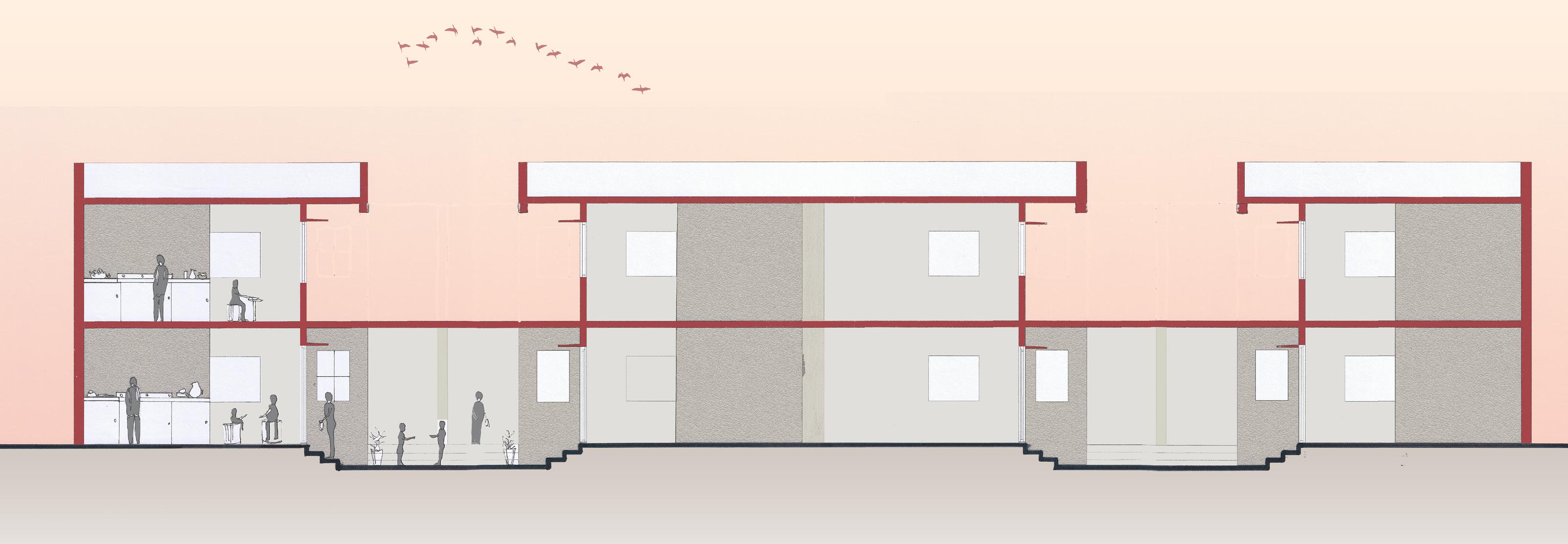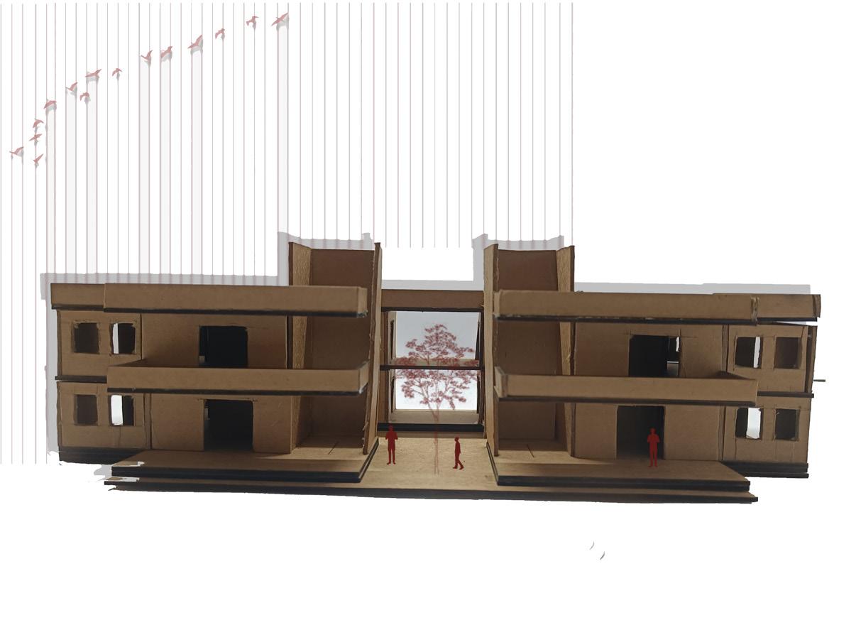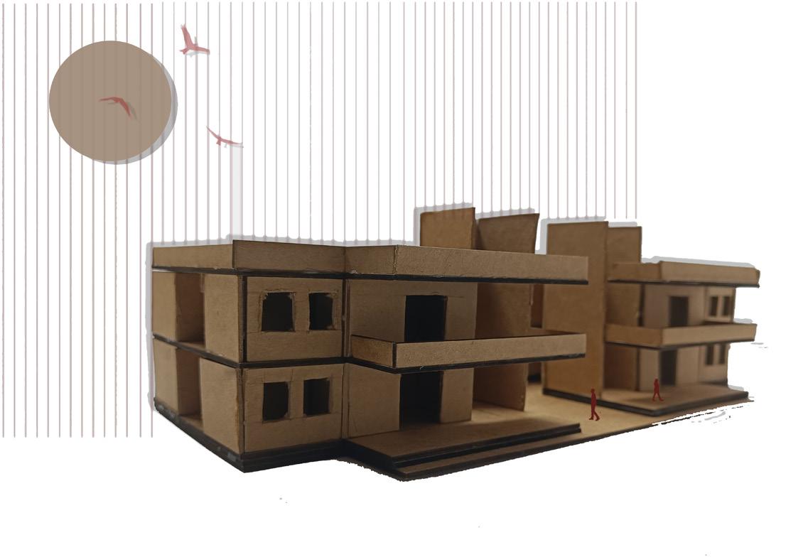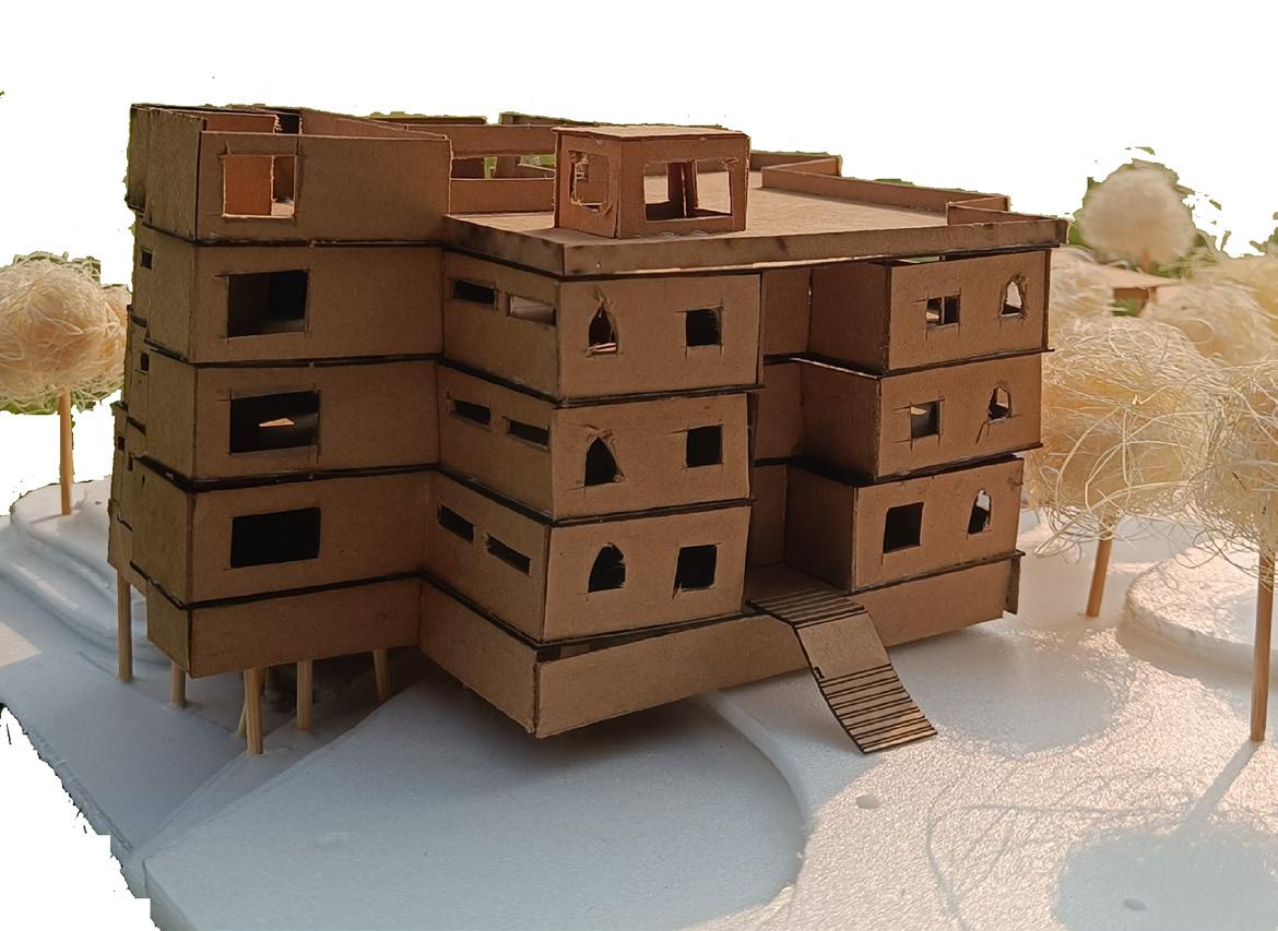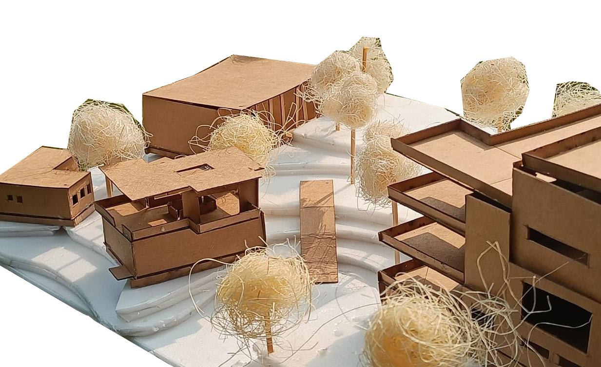 AFTER VISITING BHUJODI AS OUR SITE WE FOUND OUT THAT THE INTERACTION BETWEEN THE INDIVIDUAL COMMUNITIES LACKED, SO WE PROPOSED A LOW INCOME TYPE OF HOUSING CHOOSING AJRAKH, LEATHER AND BLOCK ARTISANS AND THEIR FAMILIES KEEPING IN MIND THE SENSE OF BELONGINGNESS , INTERACTIVE SPACES AND BRINGING THEM ALL TOGETHER BY CREATING A WORK + LIVE ENVIORMENT .