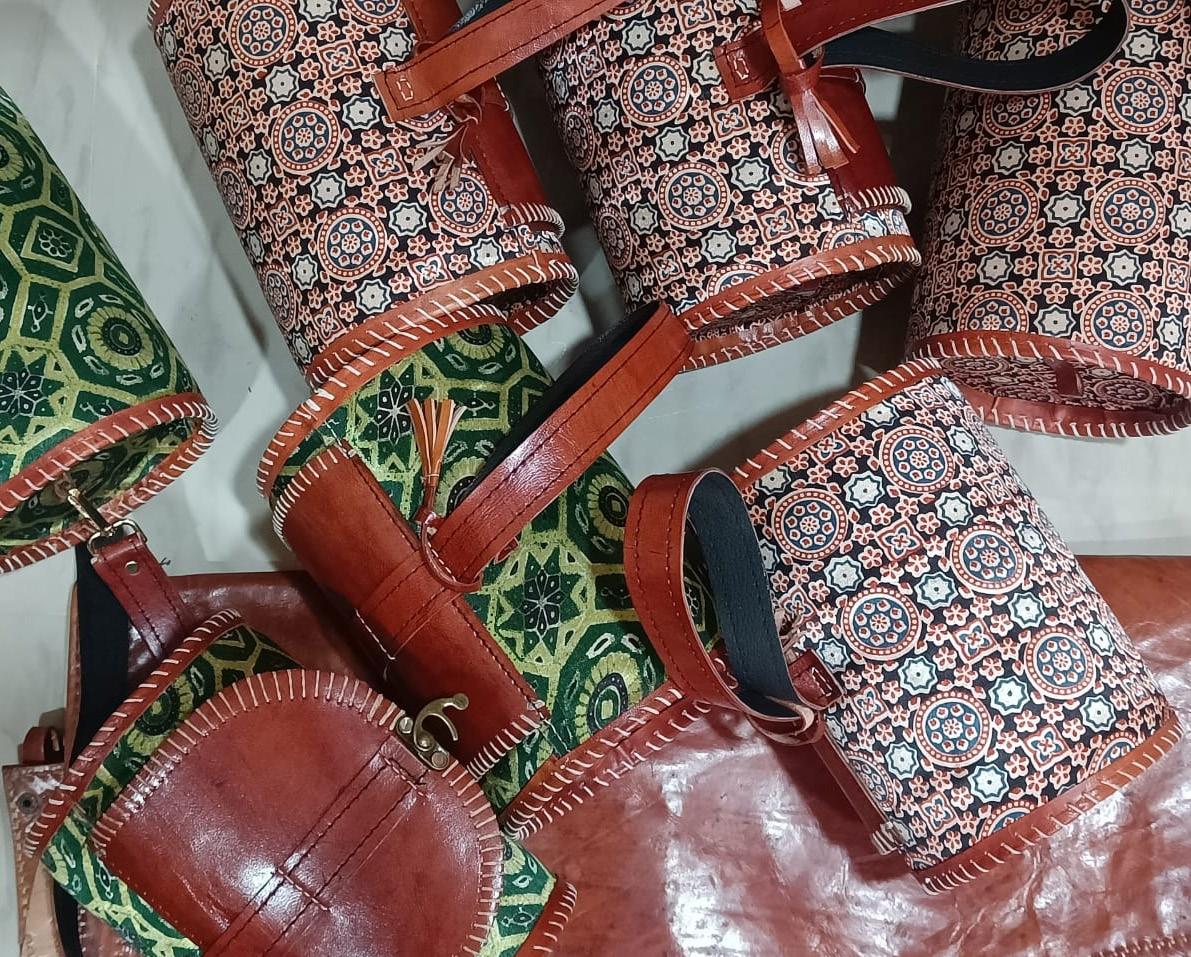 BLOCK MAKING ARTISTS PROVIDES BLOCKS TO LEATHER ARTISTS WHICH THEY USES FOR AJRAKH PRINTING AND THEN THE AJRAKH CLOTH IS USED BY LEATHER ARTISTS TO MAKE LEATHER PRODUCTS MORE EYE CATCHING.
