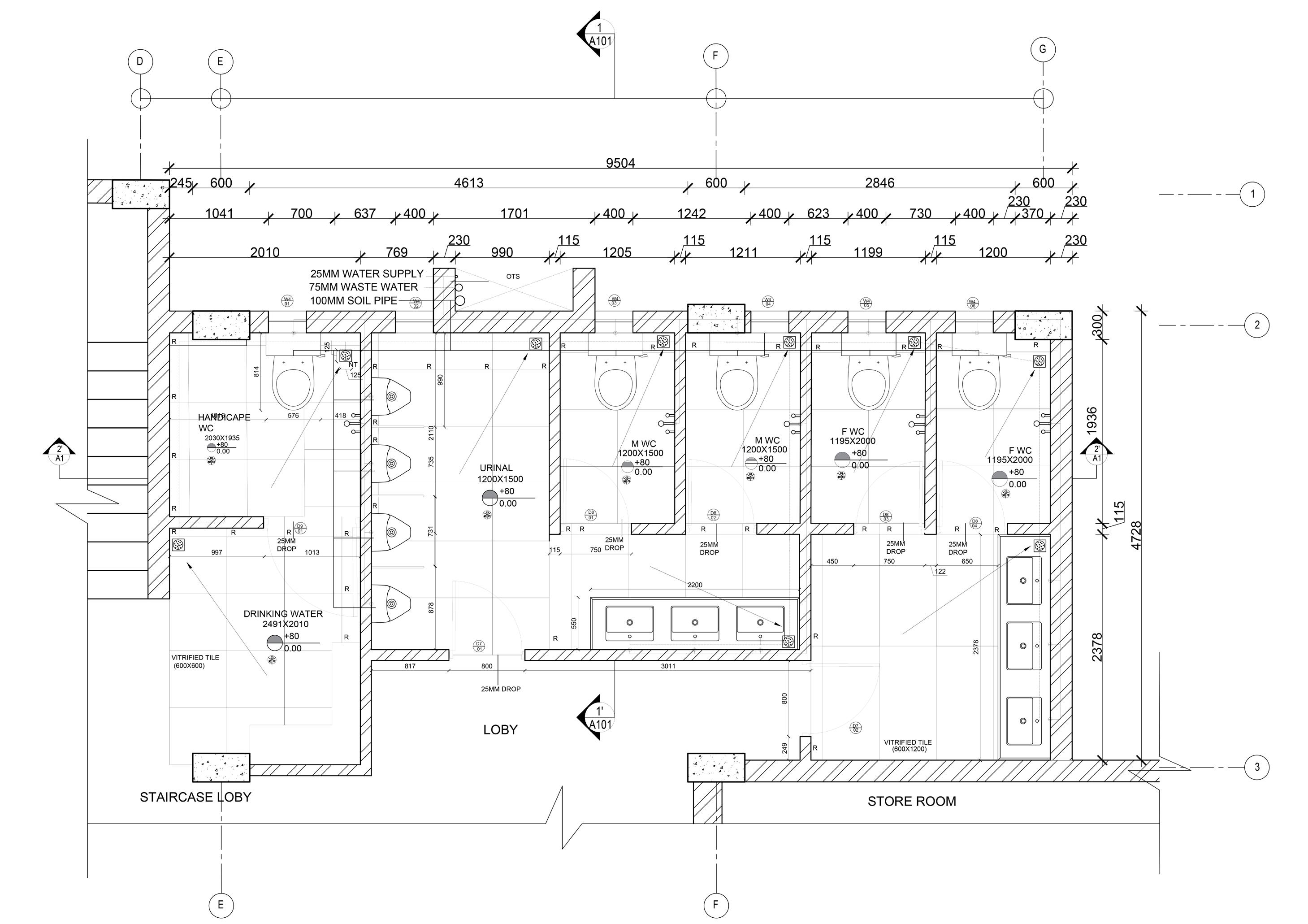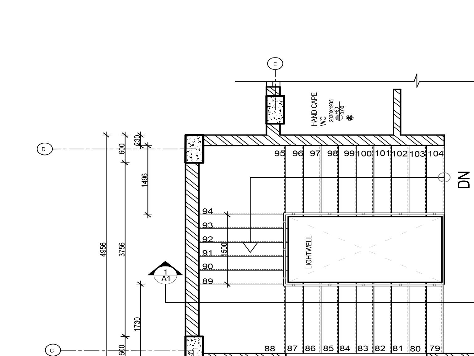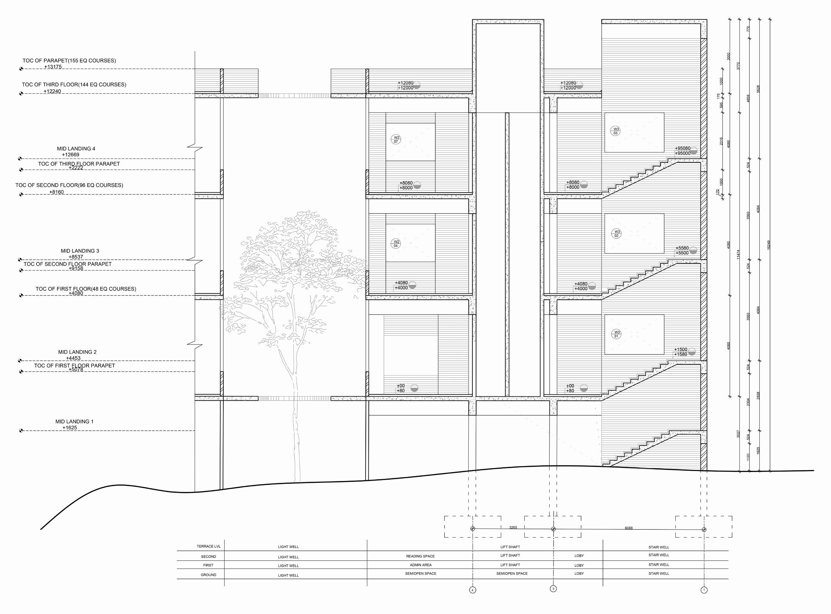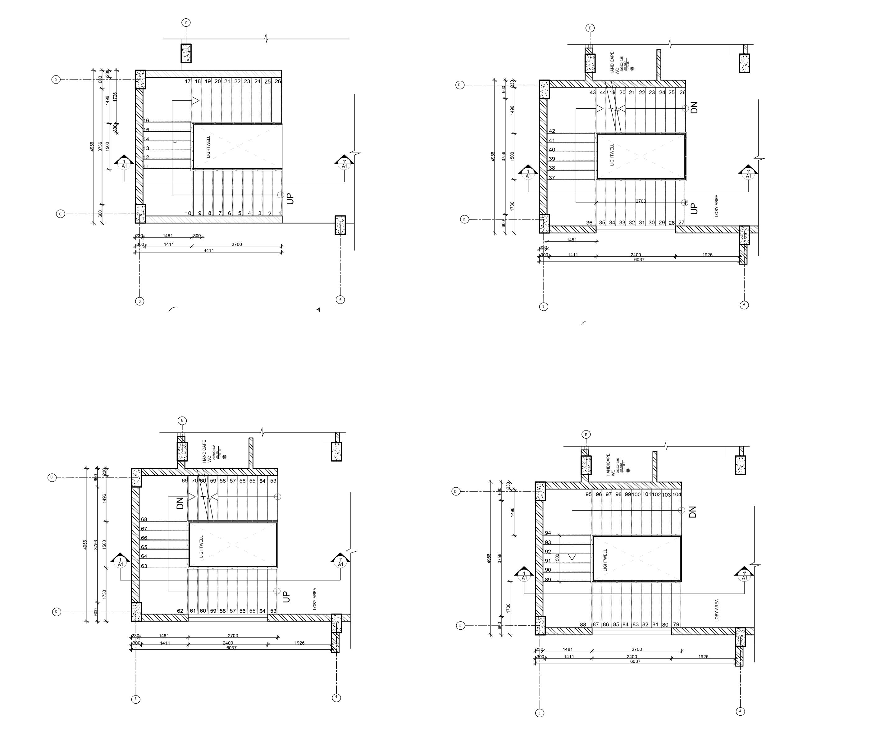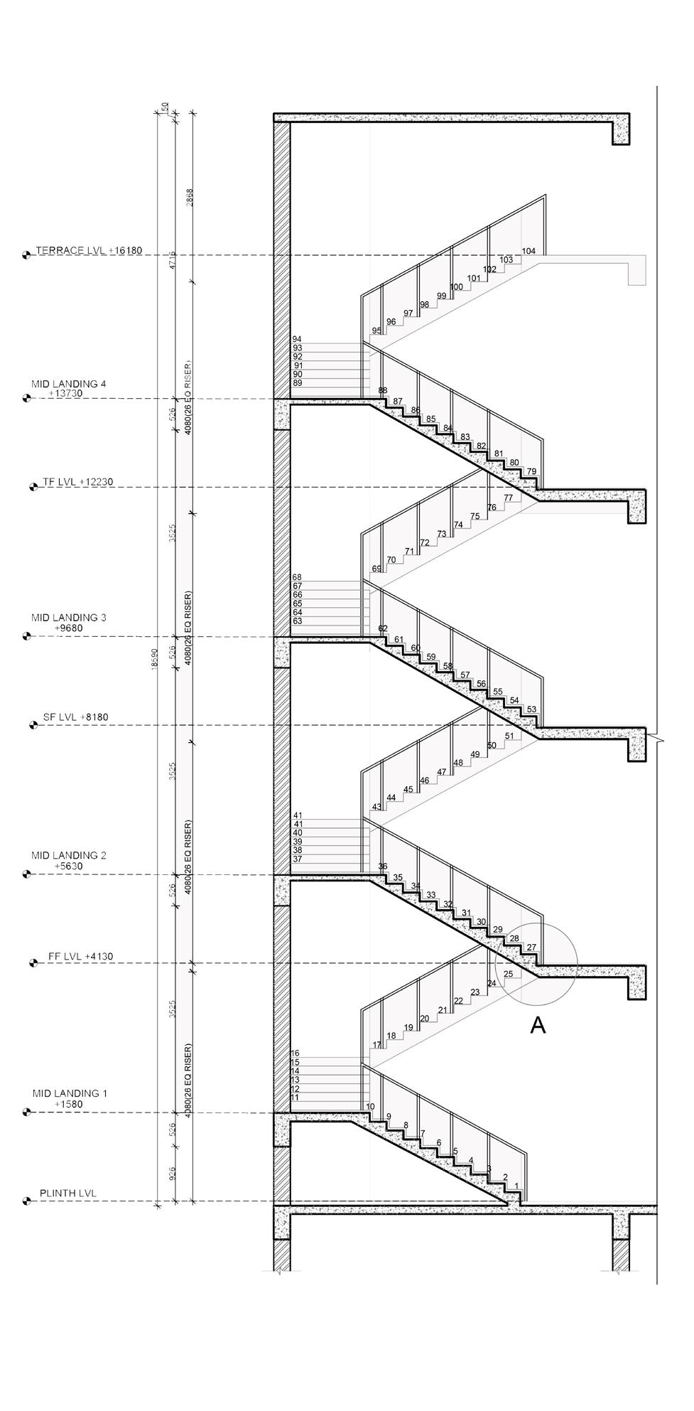 16 17 18 19 20 21 22 23 24 26 27 28 29 30 31 32 33 34 35 36 37 38 39 40 41 42 43 44 45 46 47 48 49 50 51 52 53 54 55 56 57 58 59 60 61 62 63 64 65 66 67 68 69 70 71 72 73 74 75 76 77 78 79 80 81 82 83 84 85 86 87 88 89 90 91 92 93 94 95 96 97 98 99 100 101 19445 150 5404 600 3480 600 3480 600 3480 FF LVL +4155 SF LVL +8235 TF LVL +12315 TERRACE LVL +16395 4080(26 EQ RISER) 4080(26 EQ RISER) 4080(26 EQ RISER) 3000 A 150MM THK FLOOR SLAB DETAIL A 24 27 26 25 150MM THK WAIST SLAB 3MM ANTI-SKID GROOVES CEMENT MORTAR 2MM CHAMFERED NOSING EXTENDING 10 MM 20MM THK STONE RISER 20MM THK STONE TREAD 360 300 GROUND FLOOR PLAN FIRST FLOOR PLAN SECOND FLOOR PLAN THIRD FLOOR PLAN SECTION 28 STAIRCASE PLANS