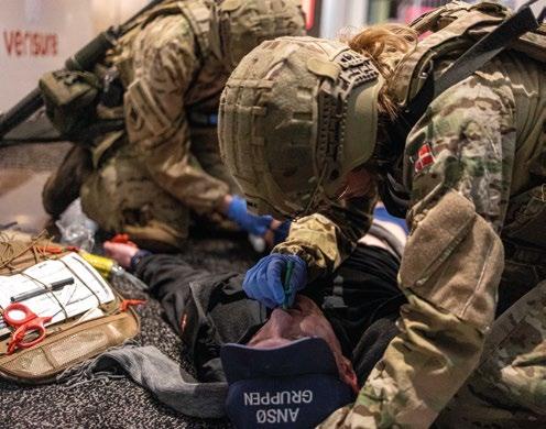 skader på luftvejene” og bliver bliver tilset og hjulpet for at sikre, at han kan få luft, skudsårene håndteres, og der meldes videre. Førstehjælpsmomentet er også afslutningen på 1½ times intens træning, og da de sårede er behandlet og klar til afhentning, er øvelsen slut.