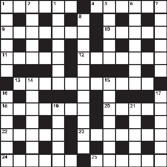 ACROSS: 1. Automatons (6), 4. Racket sport (6), 9. Female grandparent (7), 10. Two times (5), 11. Recorded sound (5), 12. Defrosting (7), 13. Not needed (11), 18. Spun by spiders (7), 20. Afterwards (5), 22. Monarch (5), 23. Copy (7), 24. Long for (6), 25. Concurred (6).