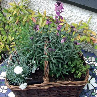 This old wicker basket is full of fragrant plants and you could move it around the garden with you, especially to a west facing evening ‘sundowner’ patio. Many fragrant plants smell best later in the day. You can use any container you have, but make sure it has drainage holes. This basket is lined with a bit of landscape fabric to stop the compost washing out.