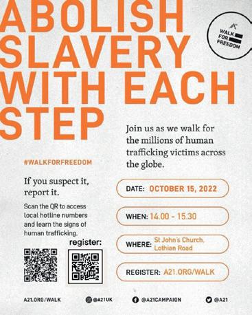 We walk for the millions of people still enslaved. Will you join us? St John’s Church, Lothian Road, 2.00pm - 3.30pm. Register at A21.org/walk