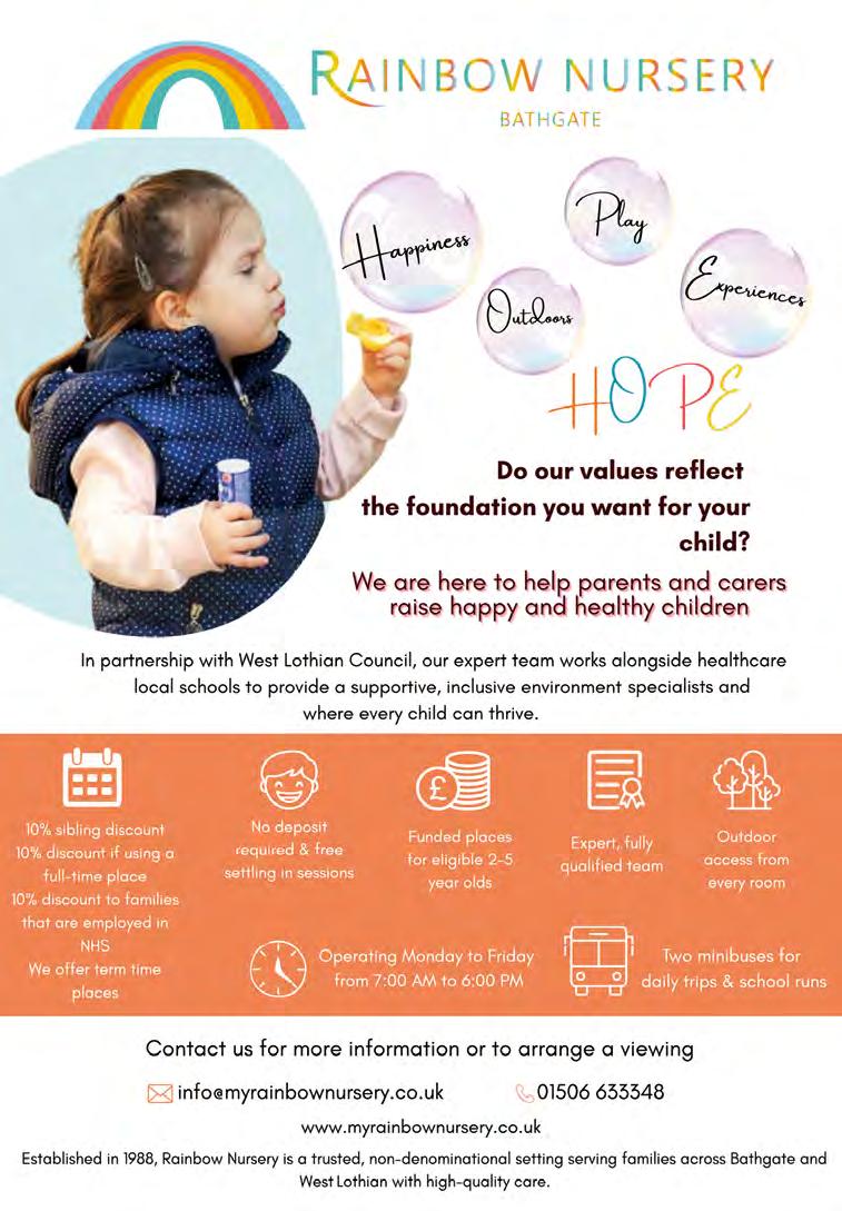 COMMUNITY PLAYGROUPS - For children age 2-5 years. Armadale, Bathgate, Crofthead Farm, Fauldhouse, Uphall and West Calder. Morning sessions 9.15-11.30am, £10.00 per session. Full Day sessions 9.15am-2.00pm, £22.00 per session. Funded Places available. W: www.communityplaygroups.org T: 07904 623176