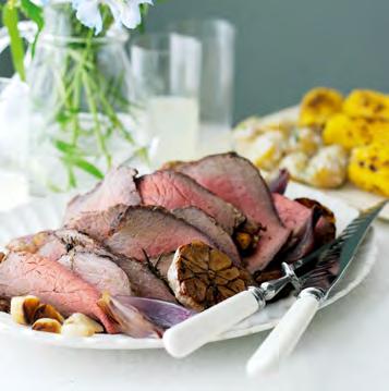 In an elegant summer twist to the traditional Sunday lunch, this beef joint is marinated in rosé wine and herbs, and served with roasted garlic and red onions.