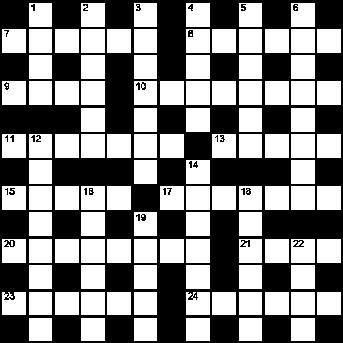 ACROSS: 7. Type of fruit (6), 8. Opulence (6), 9. Touch (4), 10. Start (8), 11. Modified (7), 13. Impede (5), 15. Remove from home (5), 17. Water closets (7), 20. Calculation (8), 21. Horrid (4), 23. Male relatives (6), 24. Snub (6). DOWN: 1. Manufactured (4), 2. Horse’s fastest pace (6), 3. Observed (7), 4. Chubby (5), 5. Specialist (6), 6. Piece of jewellery (8), 12. Splitting (8), 14. Advisory group (7), 16. Cold (6), 18. Caring (6), 19. Slightly drunk (5), 22. Lie in wait (4).