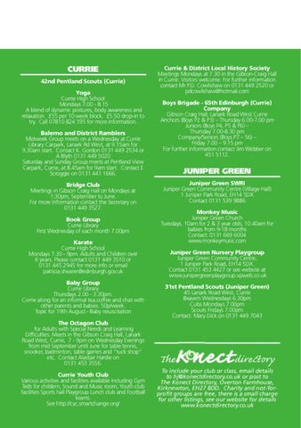 CURRIE 42nd Pentland Scouts (Currie) Yoga Currie High School Mondays 7.00 - 8.15 A blend of dynamic postures, body awareness and relaxation. £55 per 10 week block. £5.50 drop-in to try. Call 07810 824 195 for more information. Balerno and District Ramblers Midweek Group meets on a Wednesday at Currie Library Carpark, Lanark Rd West, at 9.15am for 9.30am start. Contact K. Gordon 0131 449 2534 or A Blyth 0131 449 5020 Saturday and Sunday Group meets at Pentland View Carpark, Currie, at 8.45am for 9am start. Contact E Scroggie on 0131 441 1666. Bridge Club Meetings in Gibson Craig Hall on Mondays at 1:30pm, September to June. For more information contact the Secretary on 0131 449 3527. Book Group Currie Library First Wednesday of each month 7.00pm Karate Currie High School Mondays 7.30 - 9pm. Adults and Children over 6 years. Please contact 0131 449 3510 or 0131 445 2945 for more info or email patricia.shearer@edinburgh.gov.uk Baby Group Currie Library Thursdays 2.00 - 3.30pm. Come along for an informal tea.coffee and chat with other parents and babies. 50p/week. Topic for 19th August - Baby resuscitation The Octagon Club for Adults with Special Needs and Learning Difficulties. Meets in the Gibson Craig Hall, Lanark Road West, Currie, 7 - 9pm on Wednesday Evenings from mid September until June for table tennis, snooker, badminton, table games and “tuck shop” etc. Contact Alastair Hardie on 0131 453 3556. Currie Youth Club Various activities and facilities available including Gym Teds for childern, Sound and Music room, Youth club facilities Sports hall Playgroup Lunch club and Football teams. See http://cyc.smartchange.org/
