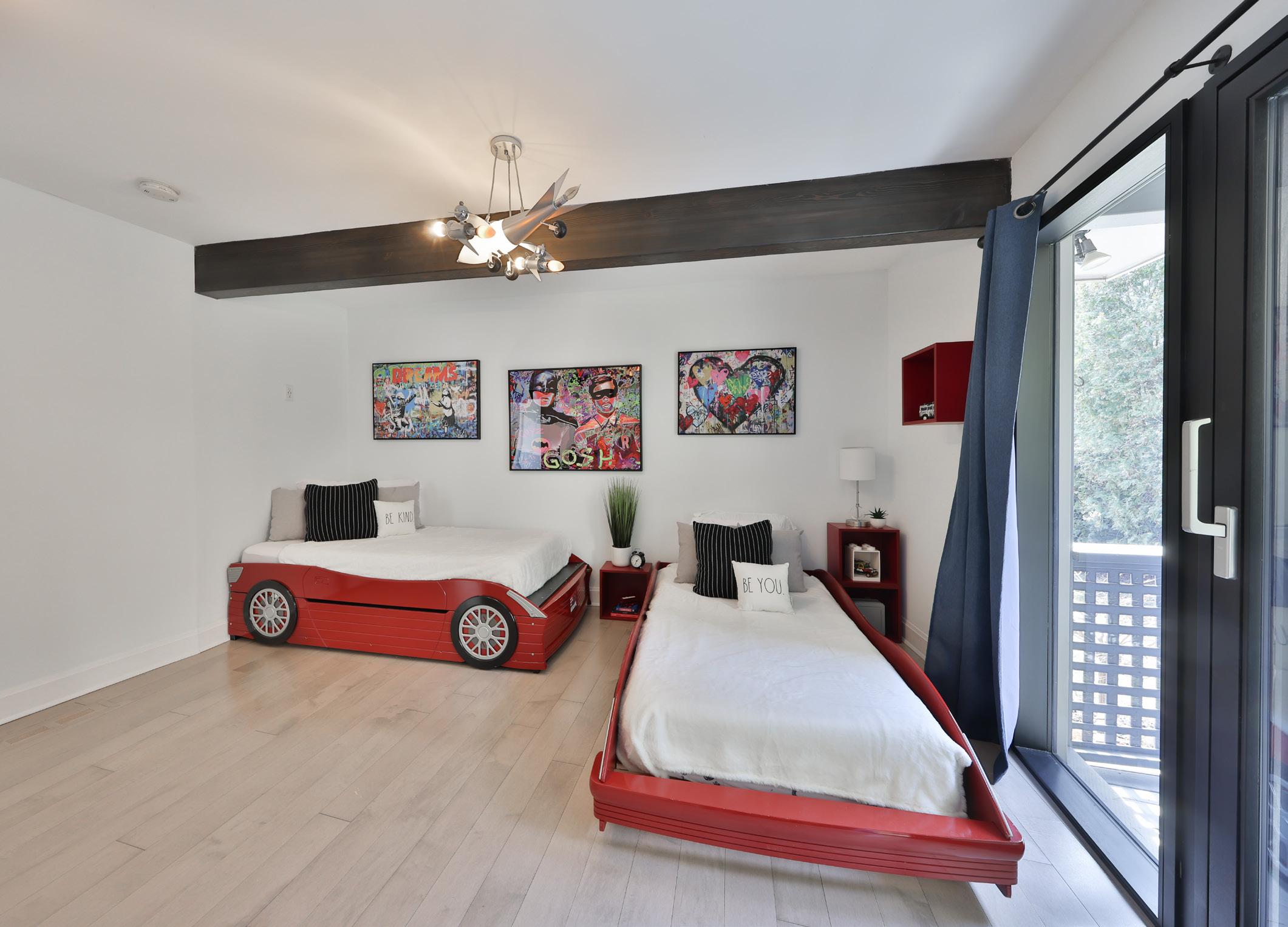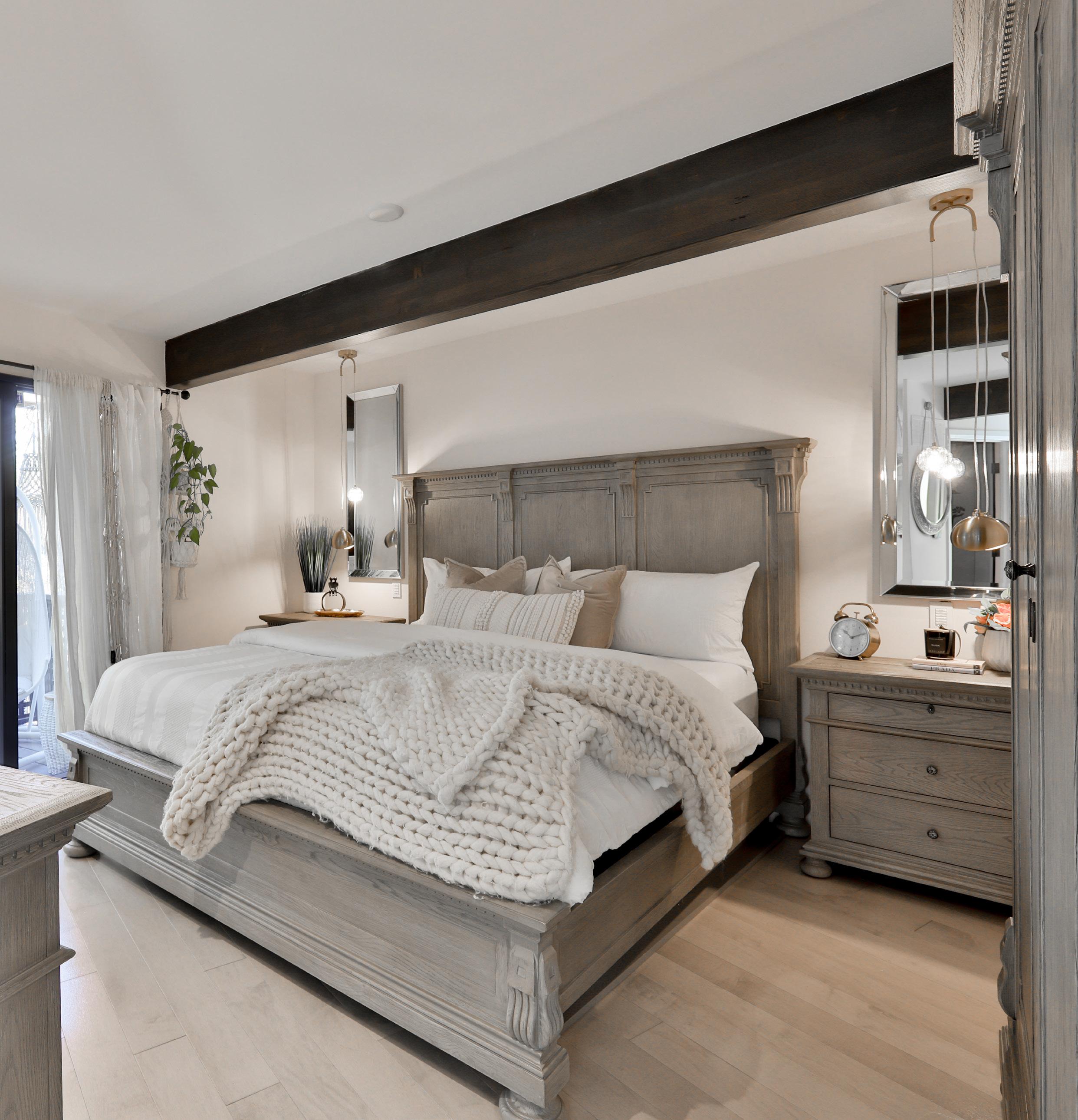 The primary suite of this custom-designed residence is a masterful blend of luxury, sophistication, and modern refinement. Rich hardwood floors set a timeless foundation, complemented by the warm glow of pot lights and the delicate allure of pendant lighting. Striking wood ceiling beams add architectural depth and character, enhancing the room’s sense of grandeur.