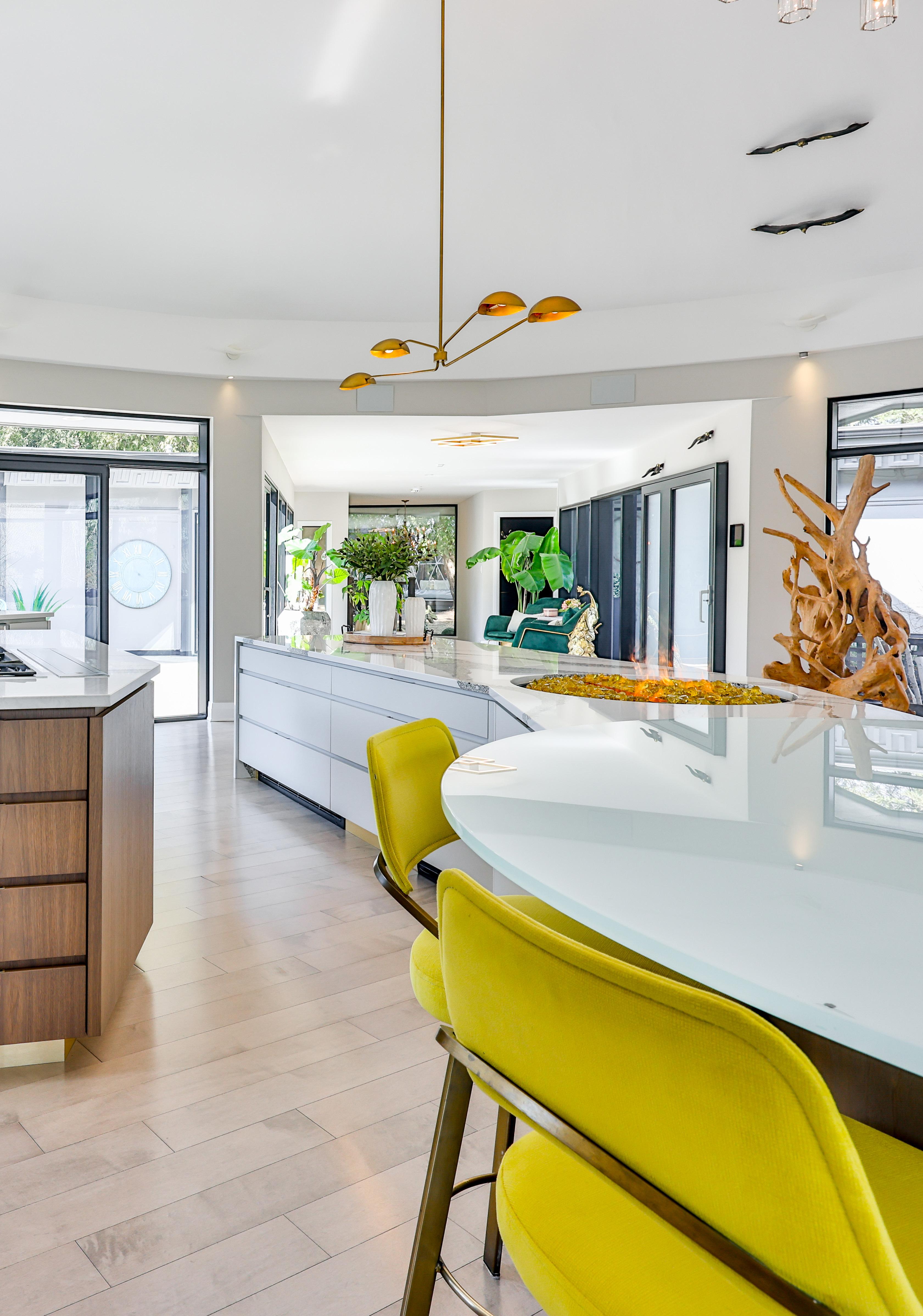 From the moment you arrive, the home captivates with its elegant architectural presence and seamless integration of indoor and outdoor spaces. Designed for those who appreciate both refined aesthetics and effortless functionality, this raised bungalow is the ultimate entertainer’s paradise. At its heart lies a breathtaking gourmet kitchen, where every detail has been carefully curated to impress even the most discerning host. Anchored by two opulent islands, this culinary masterpiece is equipped with state-of-the-art Gaggenau appliances, custom cabinetry, and sleek, minimalist finishes. A striking focal point, the custom Bauhaus bi-fold pass-through windows extend the kitchen’s presence outdoors, creating a flawless transition for al fresco dining and open-air entertaining.
