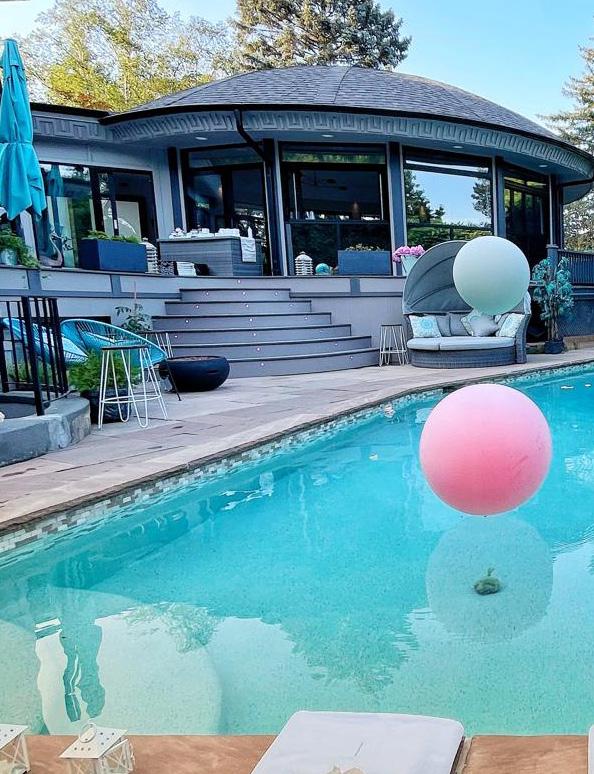 Beyond the unique exterior, the fully fenced backyard unfolds into a breathtaking private retreat, meticulously designed for relaxation and entertainment. Enveloped by mature trees and professionally landscaped grounds, this serene escape features a pristine saltwater pool and saltwater hot tub, thoughtfully illuminated by up-lighting to enhance the ambiance. The expansive composite deck provides an idyllic setting for al fresco dining, while a bespoke ship-shaped treehouse—ingeniously doubling as pool equipment storage with an elevated playhouse—adds a touch of whimsy and functionality.