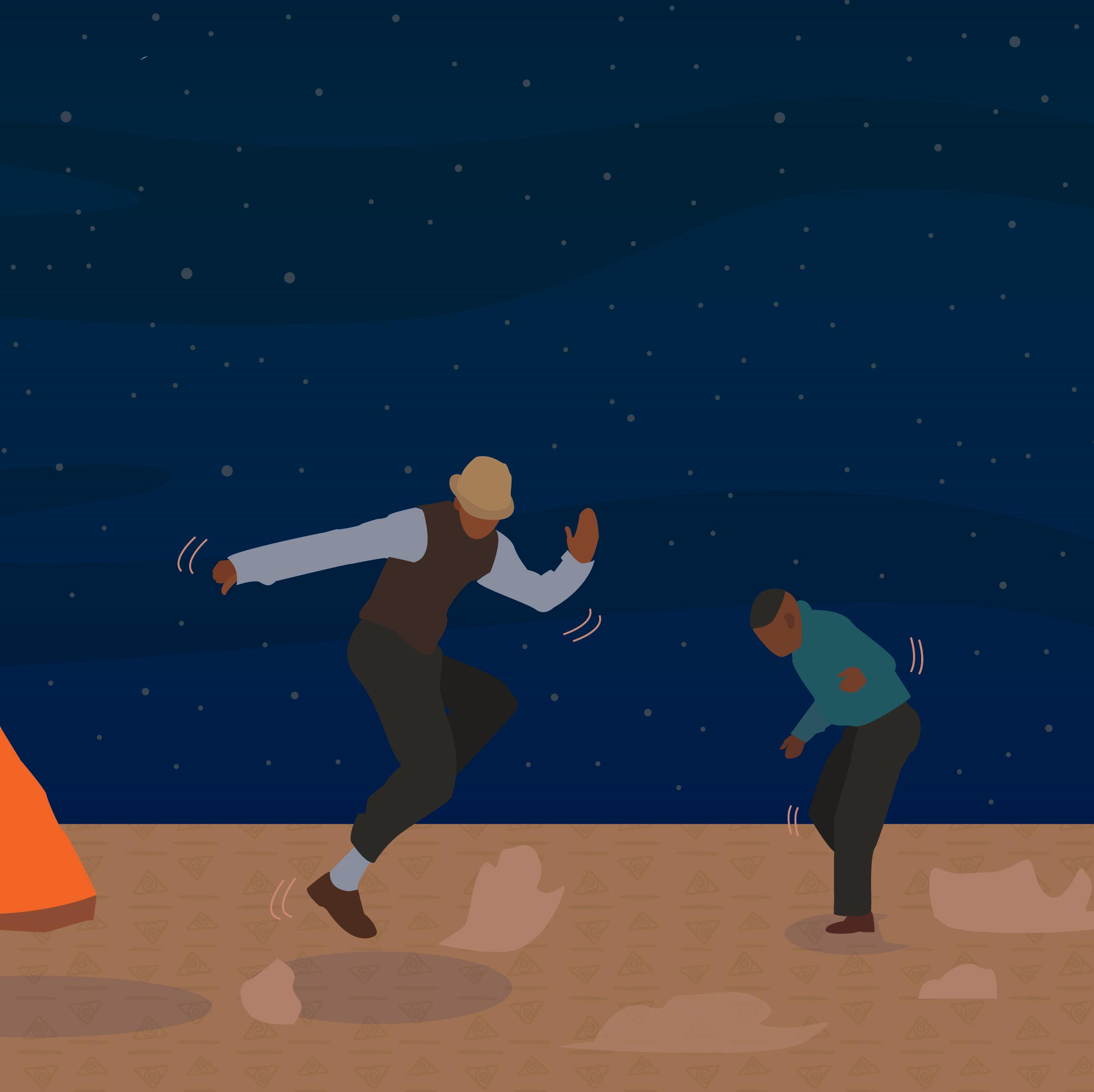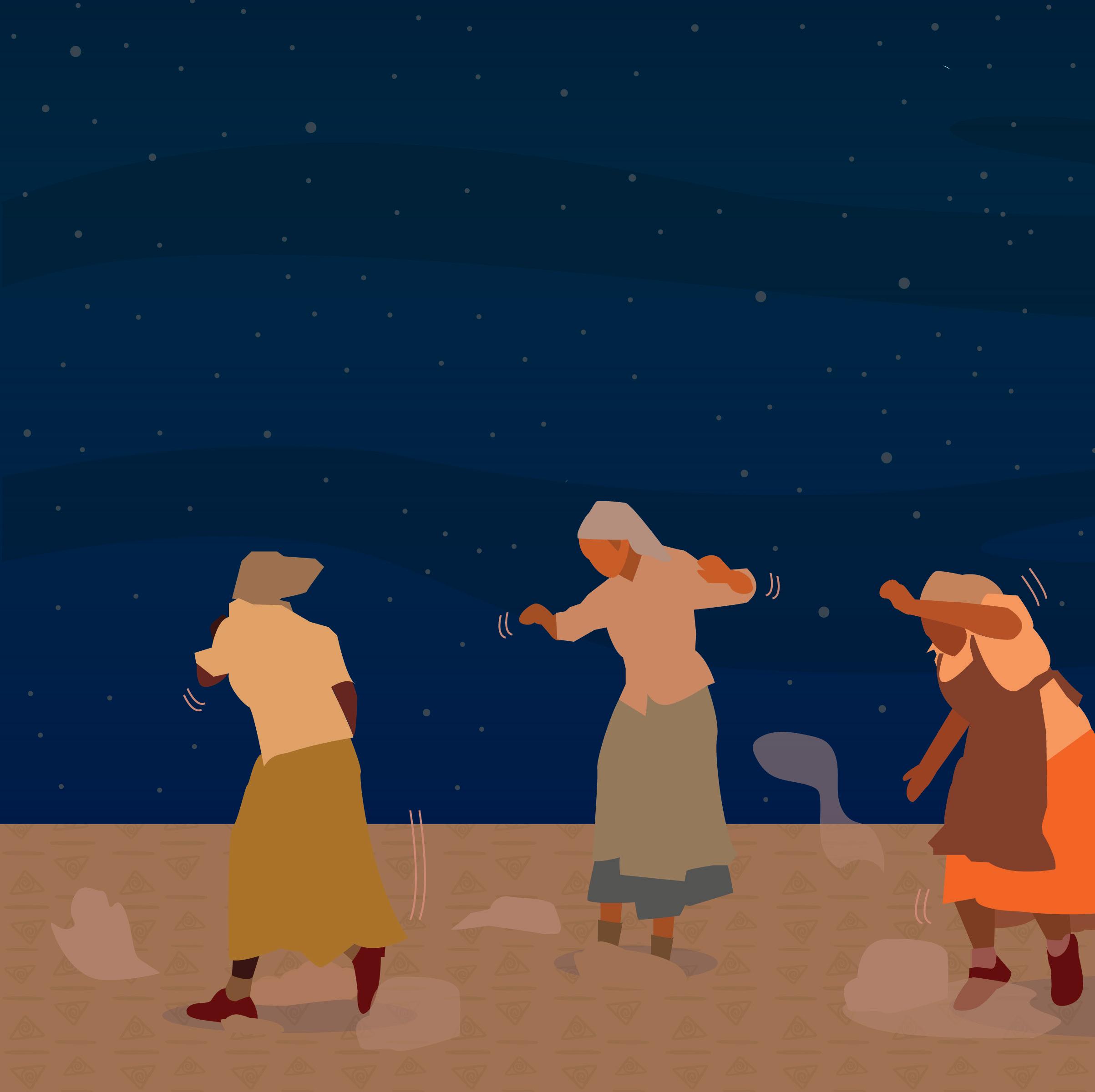 It’s described as ‘dancing in the dust’ and originally the dance of sheep shears and farm workers. The movements are about group ‘courtship’. Women perform gestures that tell a narrative story, while men mock-battle in an attempt to outdo each other with big hats and flashy moves.