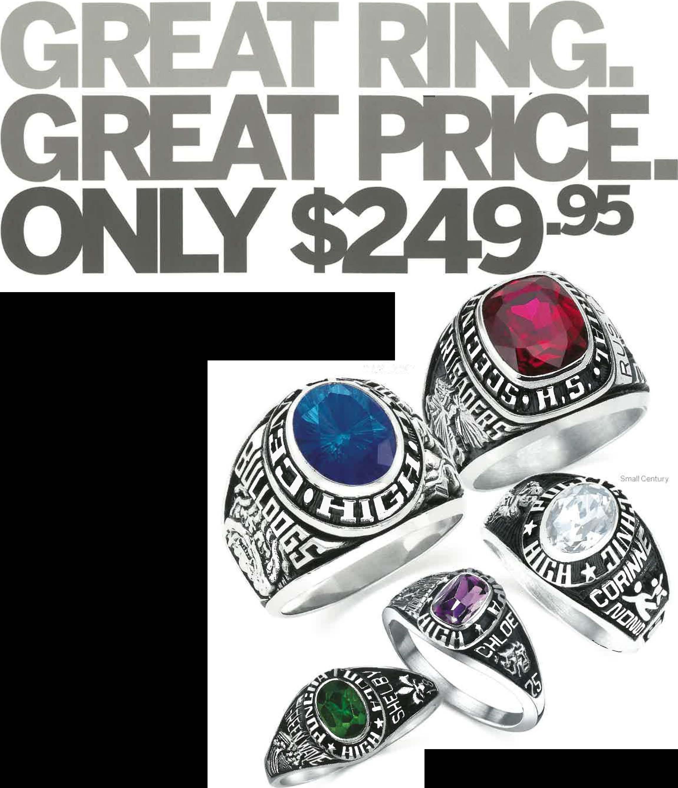Our$24995 ringspecial*featuresyour school'sofficialschoolmascotandlets youchoosefromtwoofourmostpopular stylespluspersonalizestandardfeatures includingstonecolor,cutandchoice ofPrideside'."