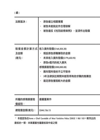• 未來收入損失賠償($179,650.95) • 原告6個月的收入損失 感情損害賠償($200,000.00) • 兩年間所受的不公平對待 • 3年法律訴訟期間未能取得有助求職的推薦信 • 裁定原告獲賠較大的金額