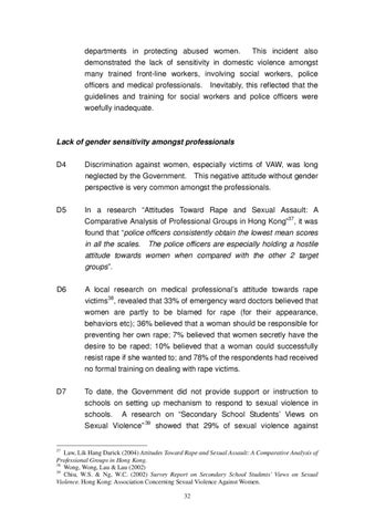 Law, Lik Hang Darick (2004) Attitudes Toward Rape and Sexual Assault: A Comparative Analysis of Professional Groups in Hong Kong. 38 Wong, Wong, Lau & Lau (2002) 39 Chiu, W.S. & Ng, W.C. (2002) Survey Report on Secondary School Students’ Views on Sexual Violence. Hong Kong: Association Concerning Sexual Violence Against Women. 32