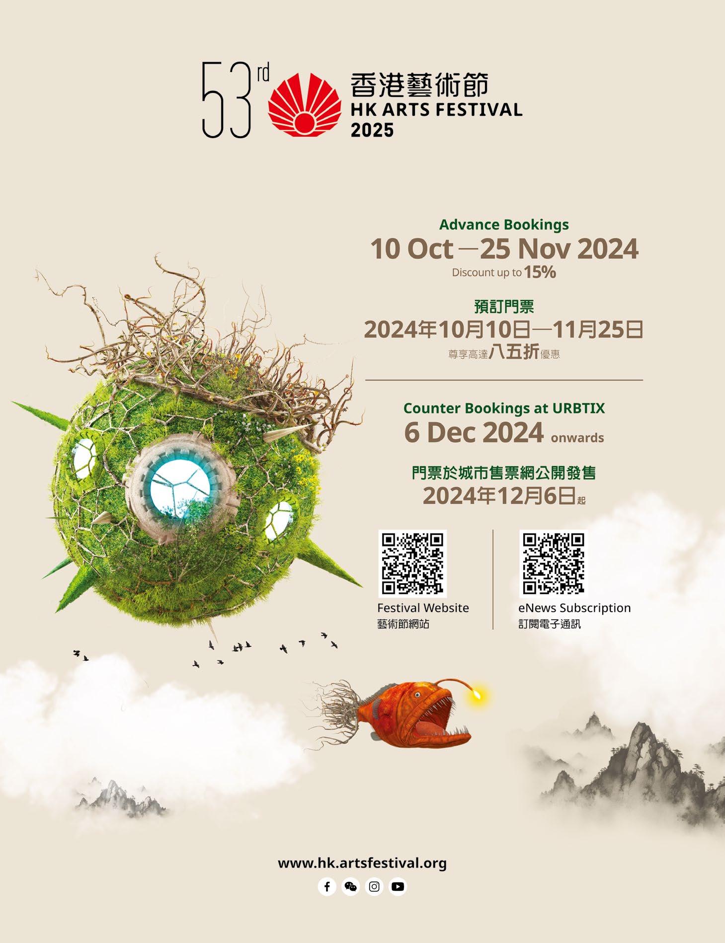 The 53rd Hong Kong Arts Festival in February and March 2025 will feature more than 1,300 renowned international and local artists appearing in a diverse array of over 125 performances of more than 45 unique programmes, alongside 300 PLUS and educational activities, all aimed at presenting world-class performing arts and promoting cultural development in our city.