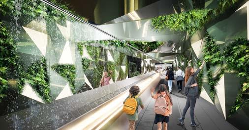 The tunnel keeps the same architectural language of the hoarding in providing a intriguing and dynamic space. The lighting and vegetation with the harmonic sound of water creates an atmosphere similar to a peace garden while diverging away from the claustrophobic nature of pedestrian foot tunnel within a construction site.