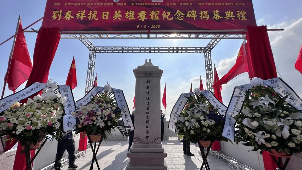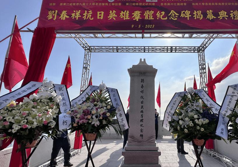 中國共產黨領導的東江縱隊港九大隊戰士們在香港浴血奮戰,保家衛國,抵 禦外侮。1943年5月某夜,港九大隊大嶼山中隊隊長劉春祥帶領六名班排骨 幹,自大嶼山東涌乘帆船前往屯門龍鼓灘,途中突遭兩艘日軍炮艇伏擊。劉 春祥等臨危不懼,激戰後船被擊沉,劉春祥、曾可送、林容、汪送、譚金火、溫 發、劉佳等七名指戰員及船家梁克夫妻二女一子全家五人壯烈犧牲。2023年 5月9日,劉春祥抗日英雄群體紀念碑揭幕典禮在香港屯門龍鼓灘隆重舉行。