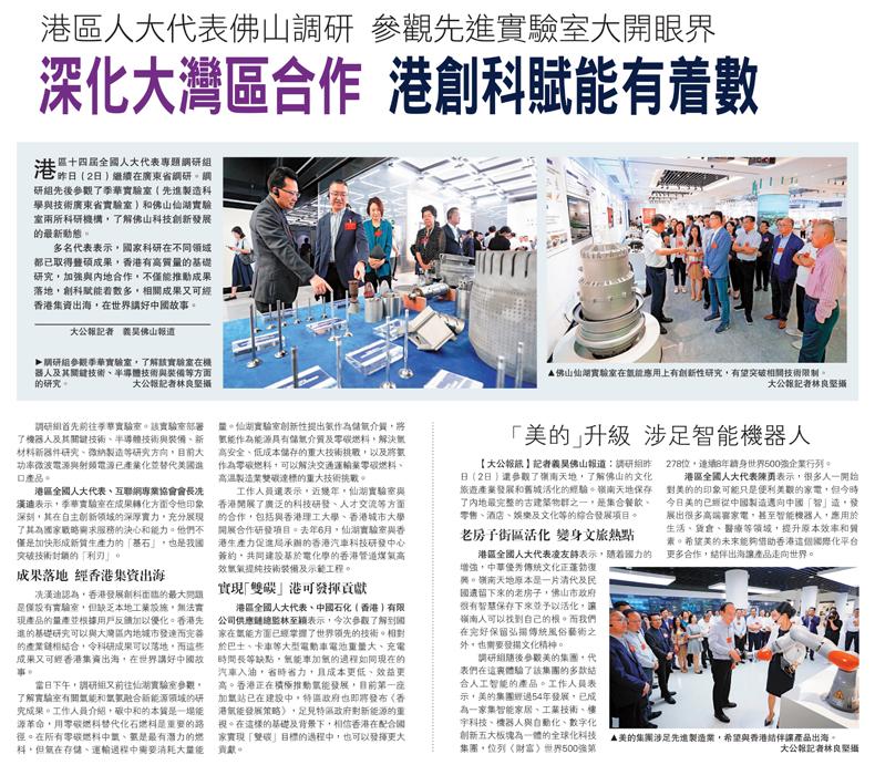 广东佛山是最早探索氢能源的城市,经多年培育发展至 今,氢能产业已经成为南海区现代产业体系的重要组成 部分,为南海成为全国氢能产业的创新引领区提供有力 支撑。调研组在佛山仙湖实验室调研时留下了深刻的影 响,有代表提出,通过季华实验室和仙湖实验室,看到佛 山市政府非常重视科研发展,投放大量资金与资源在不 同领域的科技研发,这很明显就是国家现时推广的新质 生产力,从而将我们各种产业升级转型,支撑未来科技 世界的高质量发展。希望实验室未来可以和香港一些大 学合作,现时已有理工大学,未来都希望能够和科技大 学的人工智能、机械人、生物医药、大数据等领域合作, 这样实验室可以利用香港比较优秀的科研技术研发,进 行成果转化,最后覆盖整个大湾区。