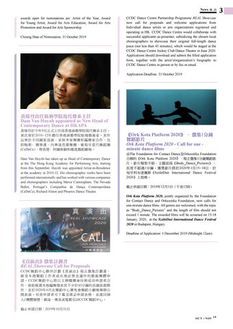 CCDC舞蹈中心夥伴計劃《真演出》現正徵集計劃書, 接受本港舞蹈工作者或在港註冊及運作的藝術團體申 請。CCDC舞蹈中心將以主辦機構身份與成功申請者合 作,資助被選本地編舞發表其不少於45分鐘的長篇原創製 作,並於2020年6月在舞蹈中心賽馬會舞蹈小劇場舉辦公 開表演。有意申請者可下載及填妥申請表格,並連同個 人/團體簡歷,親身、傳真或電郵交回CCDC舞蹈中心。 截止申請日期:2019年10月31日 O C T / N OV 1 9