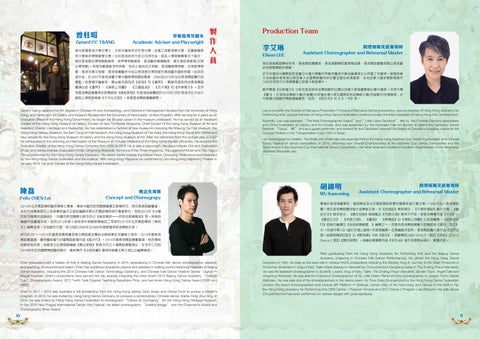 現任星榆舞蹈學校校長、星榆舞蹈團團長、香港演藝學院董事局成員、香港舞蹈總會理事及香港藝 術發展局舞蹈評審員。 近年榮獲由中國舞蹈家協會及中國文學藝術界聯合會授予最佳編導獎及小荷園丁榮譽獎。曾應加拿 大民族藝術署委派出席加拿大全國舞蹈藝術研討會並擔任表演嘉賓,並為加拿大國家電影局製作 1992年西班牙交通博覽會之加拿大館宣傳片。 創作舞劇《白髮魔女》分別在香港紫荊盃舞蹈創作比賽及加拿大素里區舞劇比賽中獲獎。另現代舞 《殤 》,於紫荊盃舞蹈大賽(作品賽)中榮獲全塲大獎及國際紫荊盃舞蹈大賽(作品賽)中榮獲銀獎 ; 近 年超過20個創作舞蹈獲編導獎,包括:《再生花》和《 水。月》等。 Lee is currently the Director of Starwave Production, Principal of Starwave Dancing Academy, council member of Hong Kong Academy for Performing Arts, council member of Hong Kong Dance Federation Limited and also the listed assessor of Hong Kong Arts Development. Recently, Lee was awarded “The Best Choreographer Award”and“ Little Lotus Gardener” title by the Chinese Dancers Association and China Federation of Literary and Art Circles. She was appointed by the Canadian Folk Art Society to attend the Canadian Dance Seminar “Focus’ 86” and as a guest performer; and worked for the Canadian National Film Board of Canada to produce videos for the Canada Pavilion in the Transportation Expo 1992 in Spain. Her choreographic creation The Bride with White Hair was awarded first in the Hong Kong Bauhinia Cup Dance Competition and Canada Surrey Festival of dance competition; in 2010, Mourning won Overall Championship at the Bauhinia Cup Dance Competition and the Silver Award in the Bauhinia Cup International Dance Competition. Her other awarded creations included: Regeneration of the Blossoms, Moonlite Silhouette, etc.