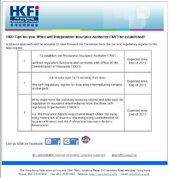 為了讓保險代理了解保監獨立的最新發 展,我們於上月開始發布題為「保監獨立 你要知」的電子簡報,凡有向保險代理登 記委員會提供有效電郵地址的登記人士, 均會定期接收到有關訊息。假如你或你的 保險代理擬收取此有用資訊,請立即登記 http://182.173.76.121/hkfi_email/index_ tc.html。