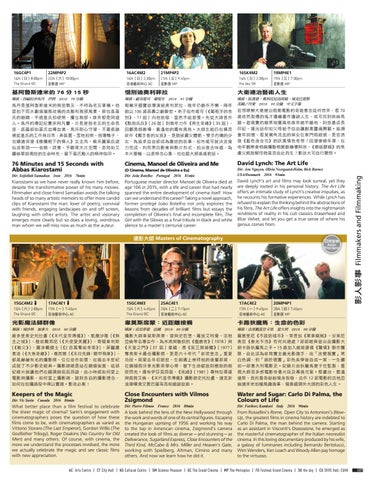 馬丹是基阿魯斯達米的親密戰友,不時為老友掌機。他 萄葡牙國寶級導演迪奧利菲拉,晚年仍創作不懈,兩年 愛拍下雨水劃過擋風玻璃的流動和剎那風景,那也是基 前以 106 歲高壽之齡辭世。弟子祖布堤可(《葡萄牙的告 氏的眼睛,不過基氏拍硬照,攫住剎那。原來都是同道 別》,11 屆)向他致敬,當然不能怠慢。先從大師首作 人。馬丹的傳記紀實非同凡響,片長便指老友的生命長 《點指兵兵》(26 屆)到晚年力作《再生奇緣》(35 屆), 度,底蘊卻如基氏自導自演,馬丹耐心守望,不着痕跡 回顧恩師教導,重溫他的獨有風格。大師生前仍在構思 捕捉基氏的工作與日常:弄裝置、雪地拍照、指導鴨子, 新作《戴手套的女孩》,是個被嚴父體罰、雙手灼傷的少 也順道探望《橄欖樹下的情人》女主角、教茱麗葉庇諾 女,為追求自由卻成為雛妓的故事,祖布堤可就決定接 仙波斯語 ─省略、詩意、予觀眾大片空間,亦宛如艾 力完成,利用黑白影像與默片形式,拍出復古味道,為 麗絲華妲偶拾的生命時光,留下基氏動人的精神烙印。 本片壓軸,以表悼念心意,也在跟大師遙遙對話。