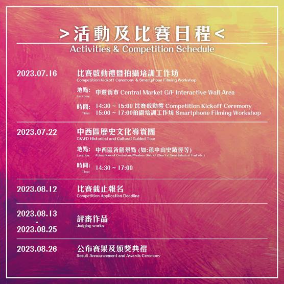 由青新半山主辦,香港區家長教師會聯會、中西 區校長聯會合辦,華懋集團、市區重建局、中環街市 作為場地夥伴的「慶祝香港特別行政區 成立 二十六周 年『微笑@中西區』手機微電影創作比賽啟動禮暨拍 攝培訓工作坊」,於七月十六日在中環街市圓滿舉行。