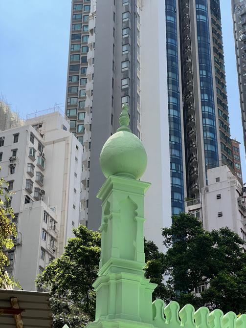 沿著些利街的扶手電梯往半山方向前進至摩羅廟街, 你會看到一棟整體以薄荷綠色為主色調,採用傳統伊斯蘭 教建築風格的清真寺——些利街清真寺(Jamia Mosque,又 名回教清真禮拜總堂),建於1849年,至今已有174年 歷史。