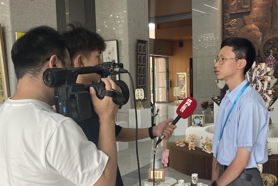在西安高新區實驗小學科學課程中心內參觀學生作品 丁潁樂(右)接受陜西當地電視台訪問