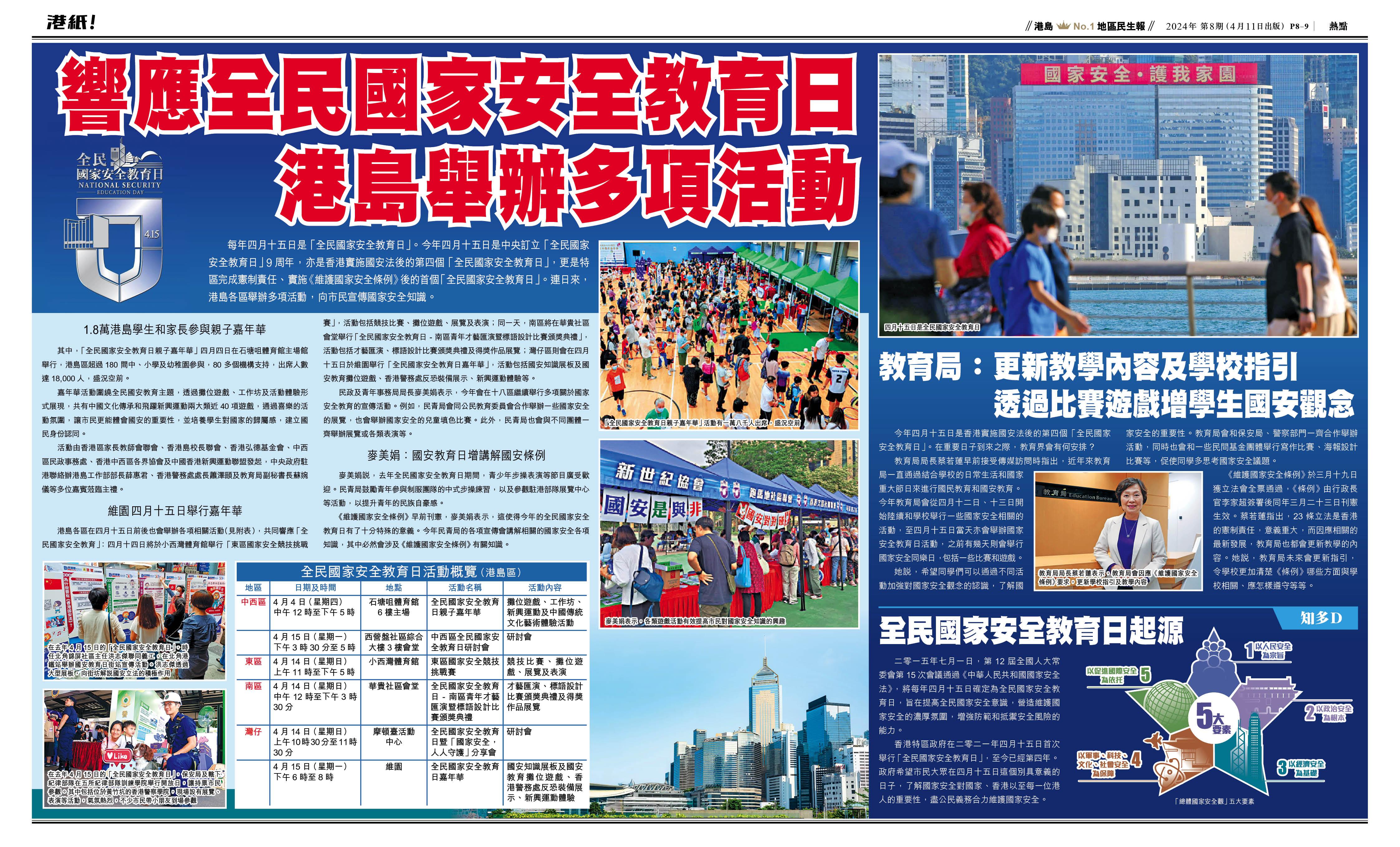 「全民國家安全教育日親子嘉年華」活動於四月四日在香港石塘咀體育館主場館舉辦。是次活 動是香港特區《維護國家安全條例》立法實施後首個國家安全教育日的一次重要活動,港島區超過 180間中學、小學及幼稚園參與,80多個機構支持,出席人數達18,000人,盛況空前。