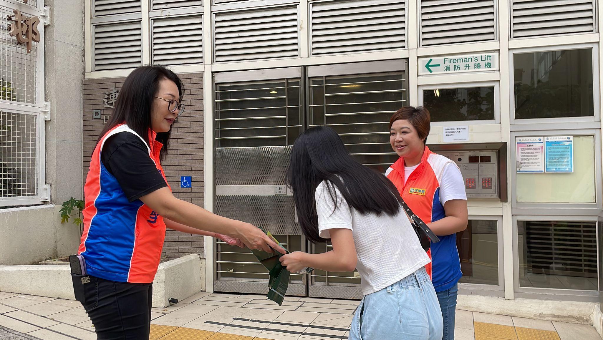 愛隊成員到達現場後,便發現該名疑似露宿人士坐在地上 休息中。他們嘗試與該名人士溝通:「看看是甚麼情況, 有甚麼地方可以幫忙?」