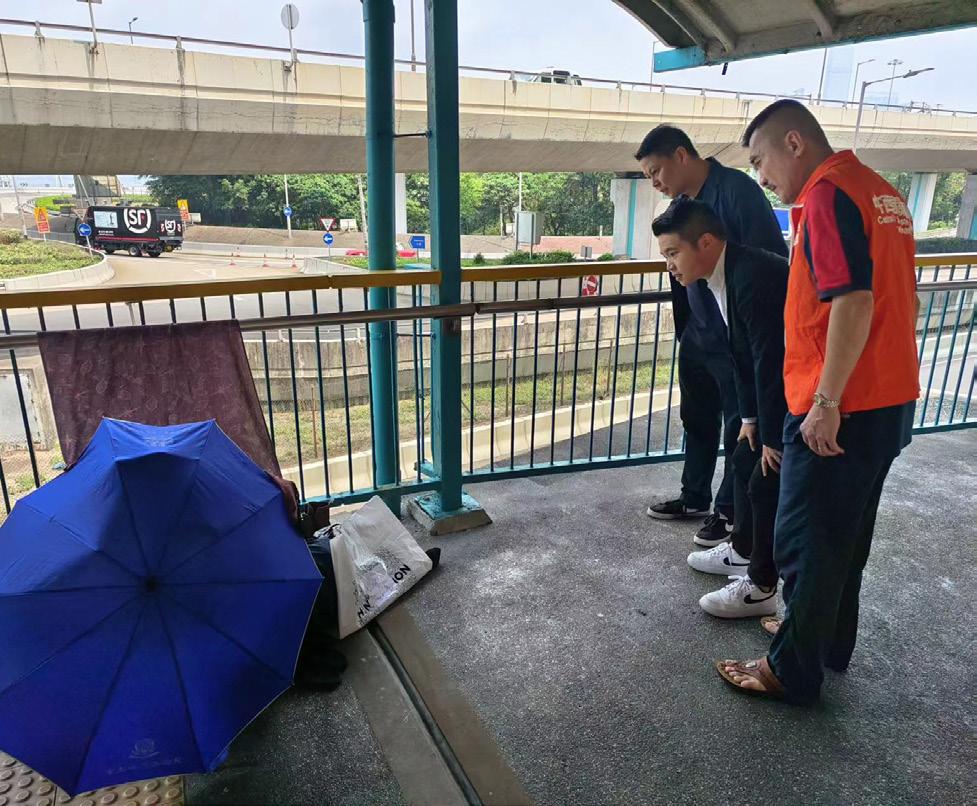 早前西營盤關愛隊隊員開展地區工作時,於 西邊街天橋發現疑似露宿者在該地露宿,中西區 區議員羅錦輝及劉天正聯同關愛隊成員立即趕到 現場了解。