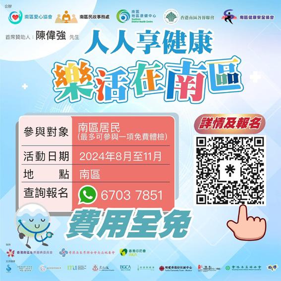 為慶祝中華人民共和國成立75周年,南區愛心協會將 於今年8月至11月舉辦「人人享健康,樂活在南區」系列 推廣活動。這個活動旨在響應特區政府《基層醫療健康藍 圖》的倡議,為南區居民提供全方位的健康服務。活動得 到南區民政事務處、南區地區康健中心、香港南區各界聯 會、南區健康安全協會以及首席贊助人陳偉強的大力支持。