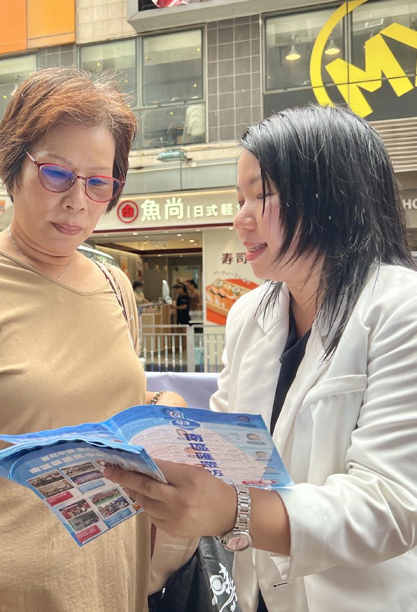 南區區議員林詠 欣(右)向市民 匯報工作報告