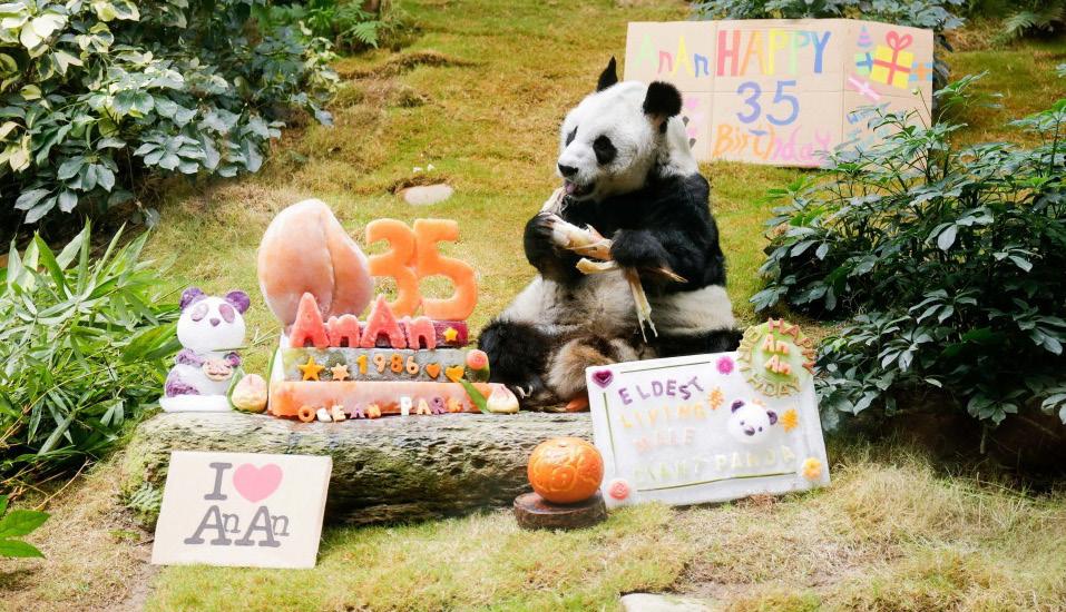 安安在香港的悉心照顧下,成為全球在人類照顧下最長壽的雄性大熊貓。圖為安安度過35歲生日